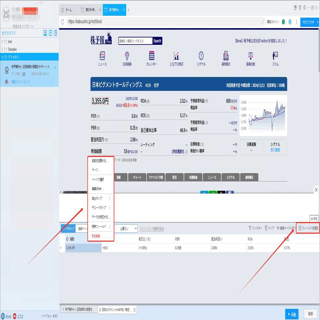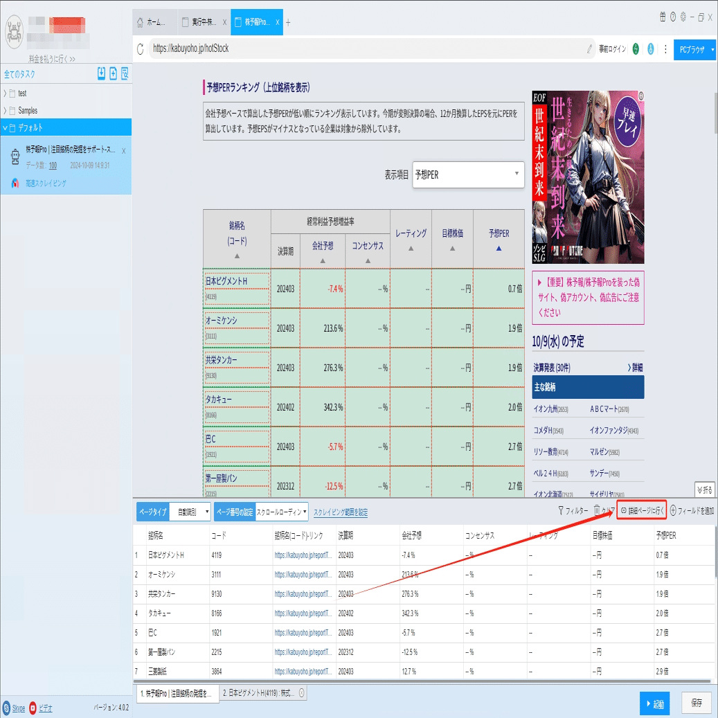 ソフトウェアの「詳細ページに行く」機能を利用し、前日比、PBR、配当利回り、ROAなどの情報を抽出します。