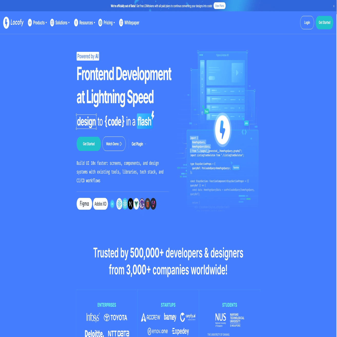 Locofyは、デザインファイル(FigmaやSketchなど)をフロントエンドコードに変換するツールです。デザイナーは、React、Vue、またはHTML/CSSなどのコードを自動生成でき、手動でのコーディング作業を減らし、開発サイクルを短縮できます。