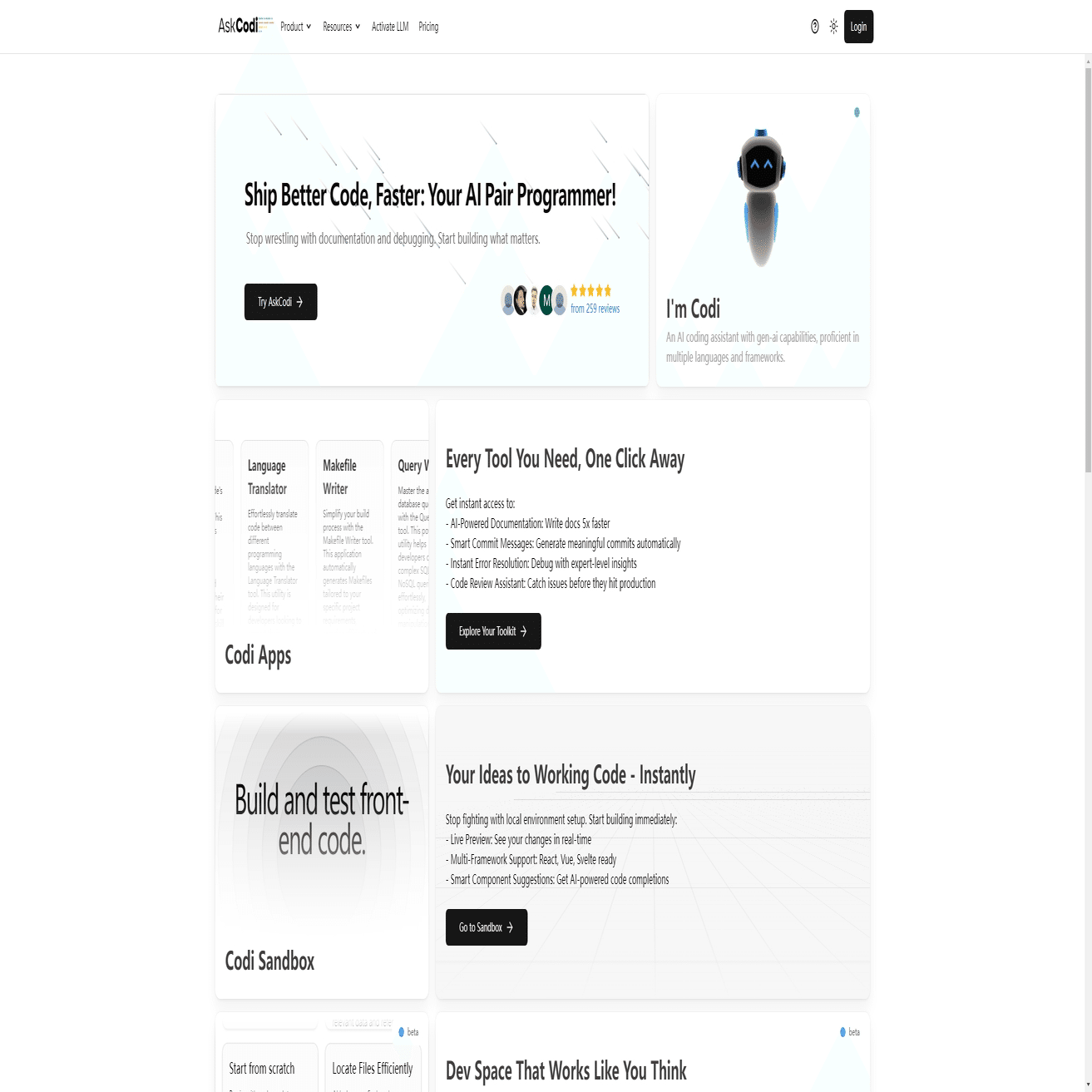 AskCodiは、AIベースの開発アシスタントで、ソフトウェア開発のワークフローを効率化することに特化しています。コードの作成、ドキュメントの生成、ユニットテストの作成、コードの最適化などをサポートします。AskCodiは、複数のプログラミング言語とフレームワークに対応し、ユーザーはそのインターフェースを通じて簡単にコードのクエリや学習、補完ができます。