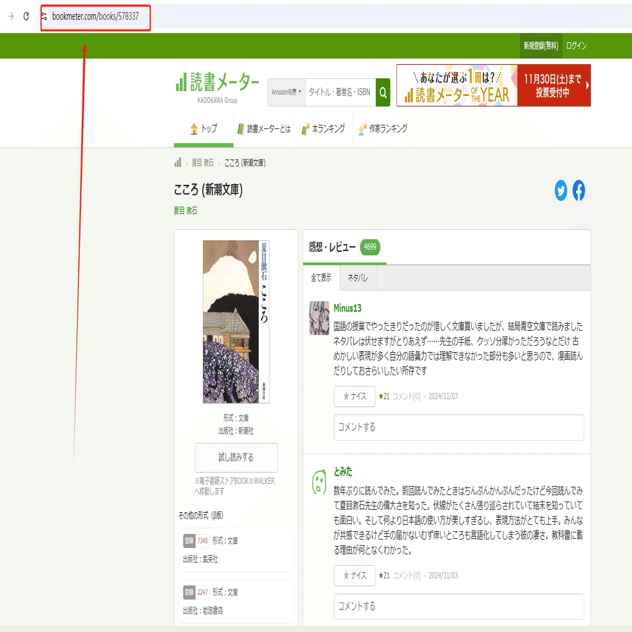 今回はある人気書籍のレビュー一覧ページからレビュー・感想を収得し、そのスクレイピング方法を紹介します。まず、URLをコピーしてください。