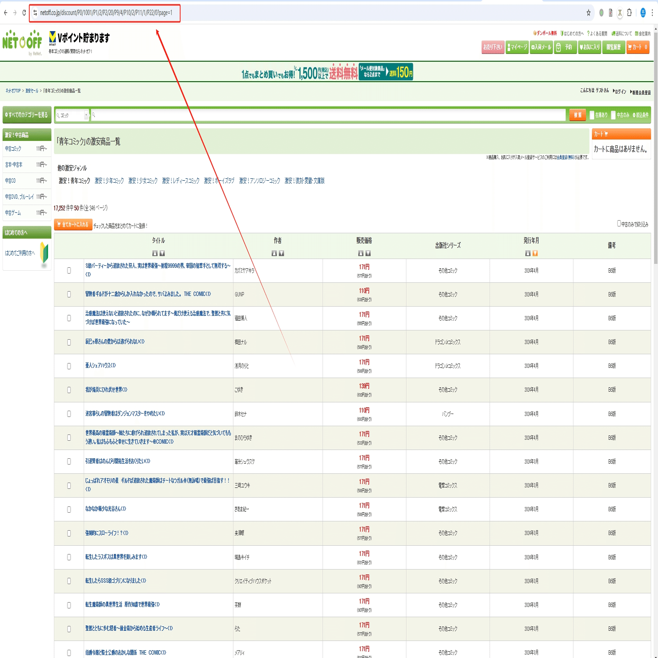 今回は「青年コミック」の激安商品一覧ページから商品の情報を収得し、そのスクレイピング方法を紹介します。まず、URLをコピーしてください。