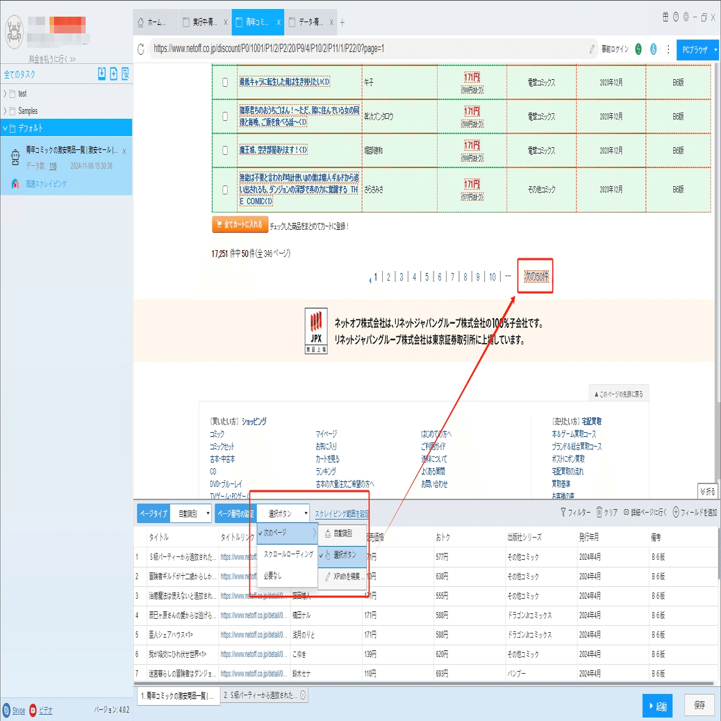 ScrapeStormは自動的にリスト要素とページボタンを識別できます。偶に誤差があれば、手動で選択してください。下記のチュートリアルも参照してください。
