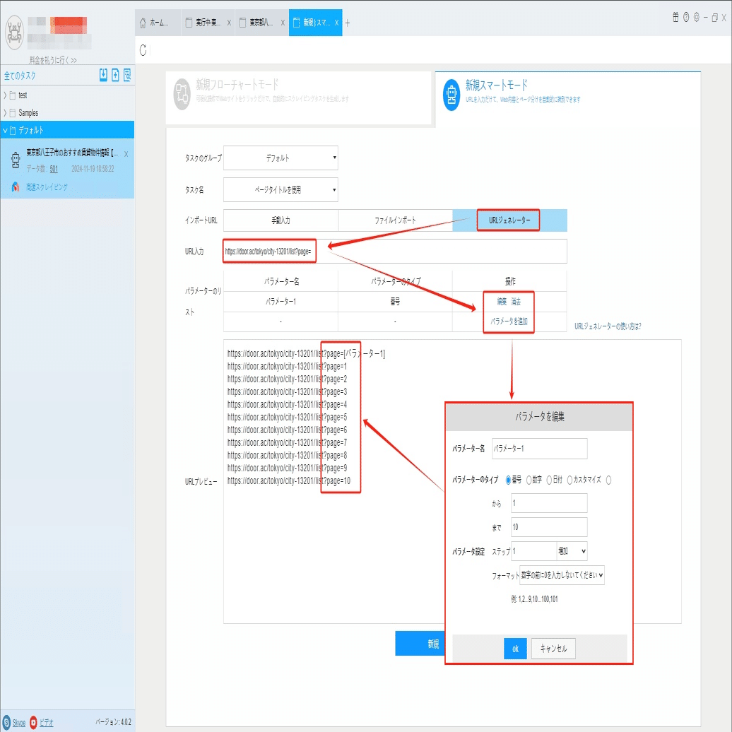 URLジェネレータでURLを入力して、パラメーターを追加画面にページ数を入力します。今回は1から10までです。生成したURLはプレビュー画面でチェックしてください。