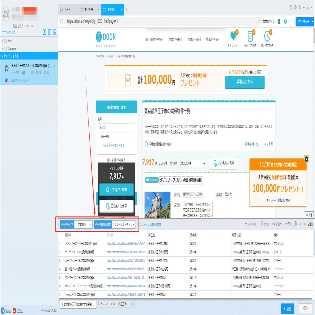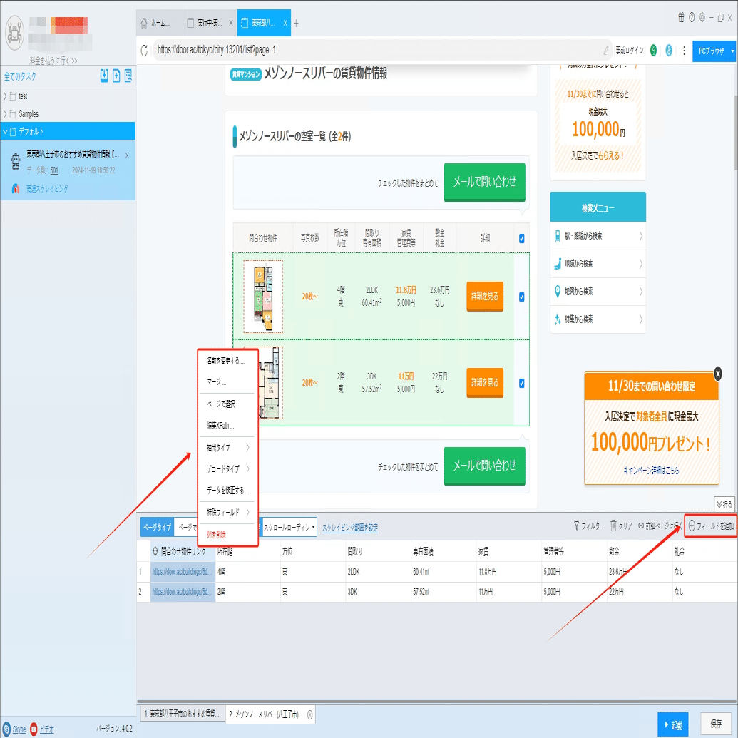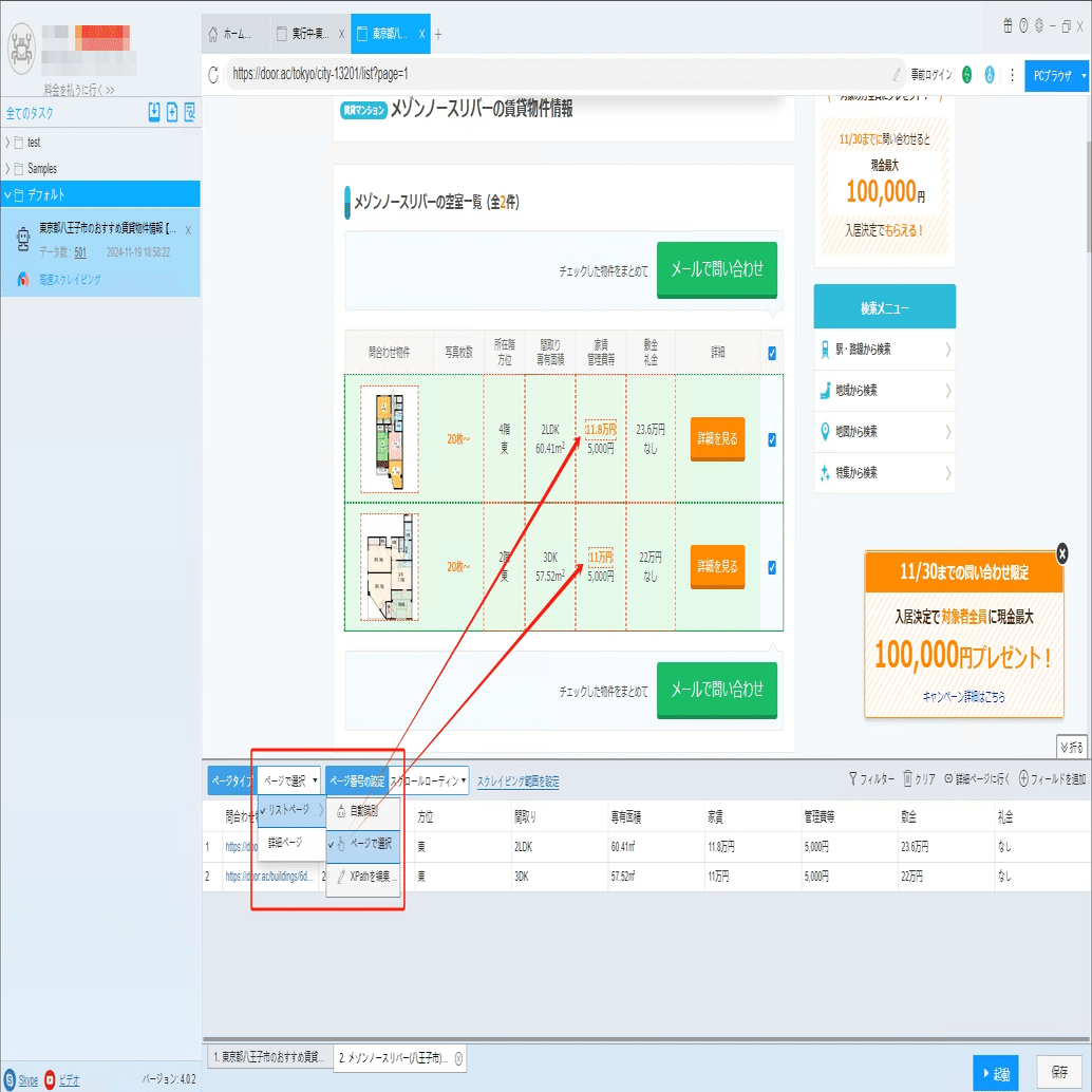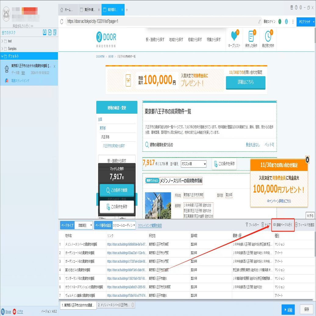 ソフトウェアの「詳細ページに行く」機能を利用し、専有面積、管理費、敷金などの情報を抽出します。