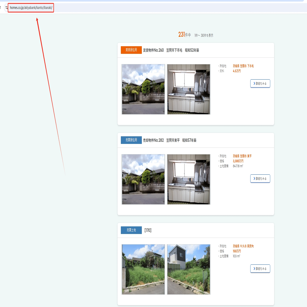 今回は茨城県の空き家物件一覧ページから物件の情報を収得し、そのスクレイピング方法を紹介します。まず、URLをコピーしてください。