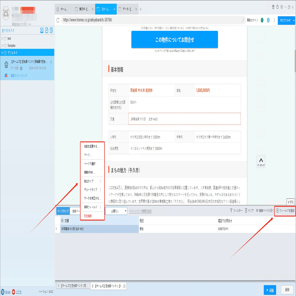 ソフトウェアの「詳細ページに行く」機能を利用し、交通、現況、お問い合わせ番号などの情報を抽出します。