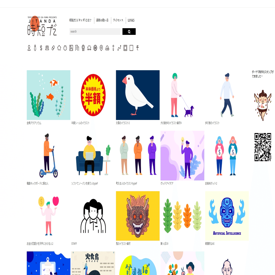 「時短だ」は、素材探しの時間を短縮することを目指して作られた素材サイトです。ユーザーの使いやすさを最優先にしたシンプルなデザインと検索機能が特徴です。
