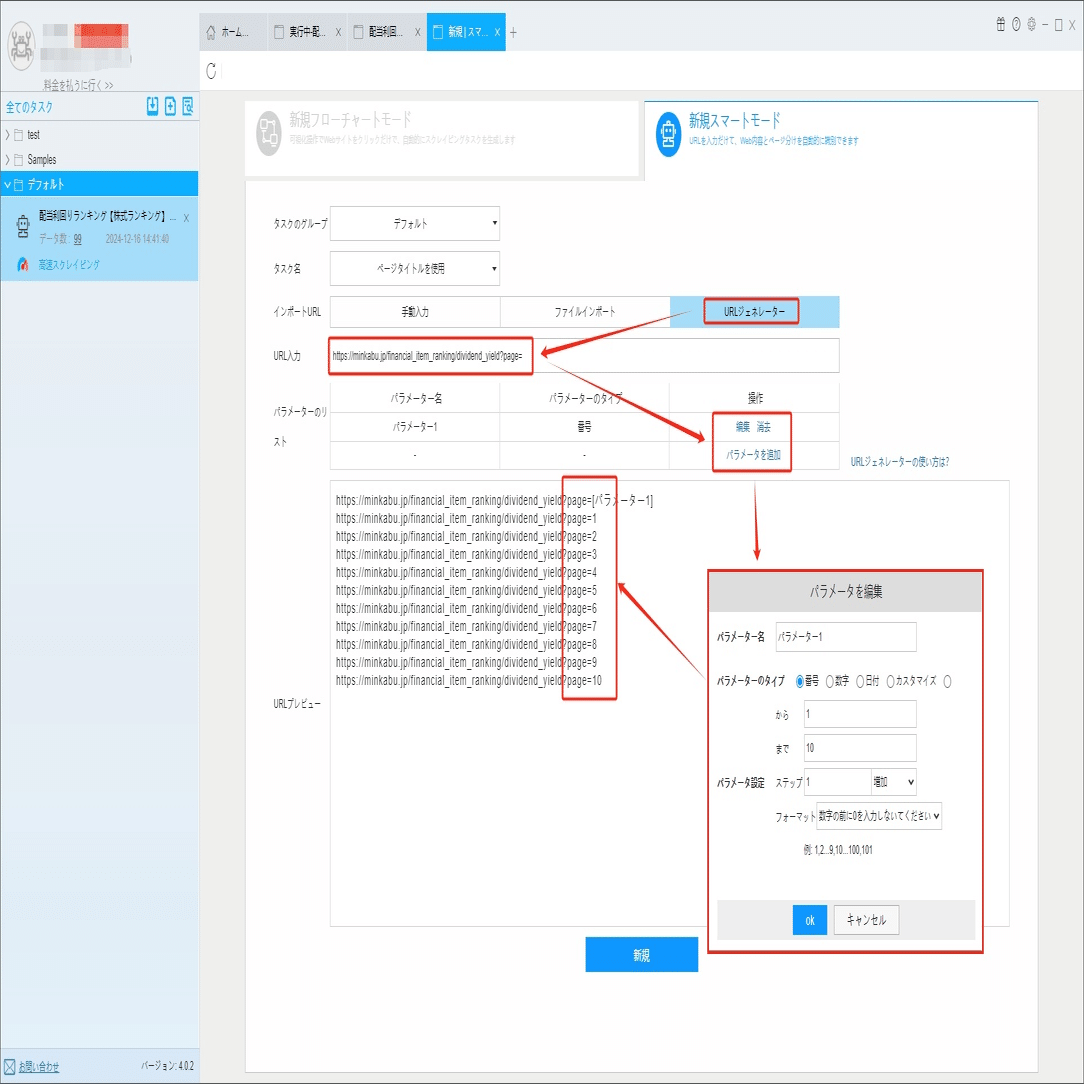 URLジェネレータでURLを入力して、パラメーターを追加画面にファイルから銘柄コードを読み込みます。生成したURLはプレビュー画面でチェックしてください。