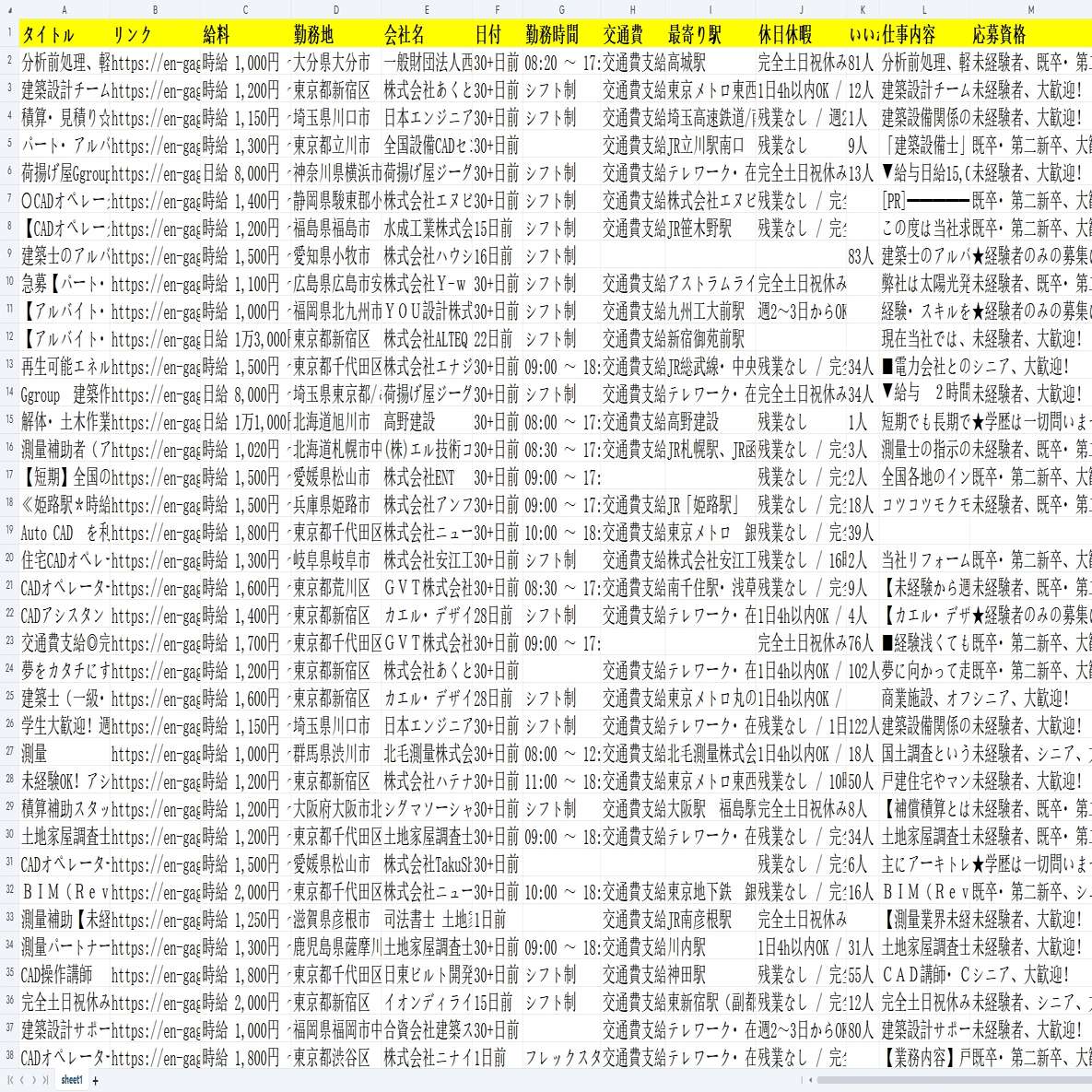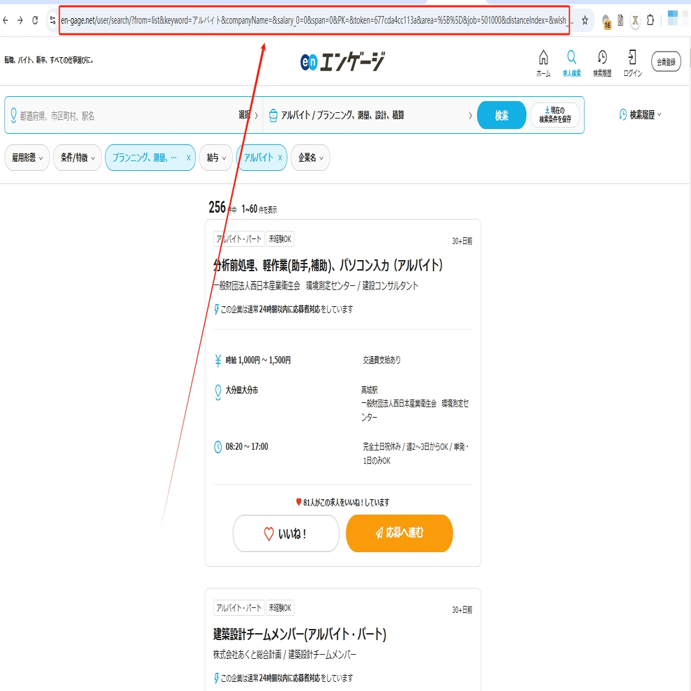 今回はアルバイト/プランニング、測量、設計、積算の求人情報一覧ページを例として、そのスクレイピング方法を紹介します。まず、URLをコピーしてください。
