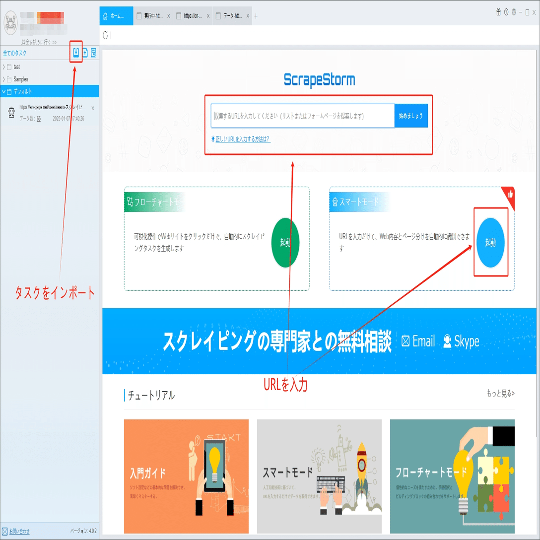 ScrapeStormのホームページ画面にスマートモードタスクを新規作成します。また、持っているタスクをインポートすることもできます。