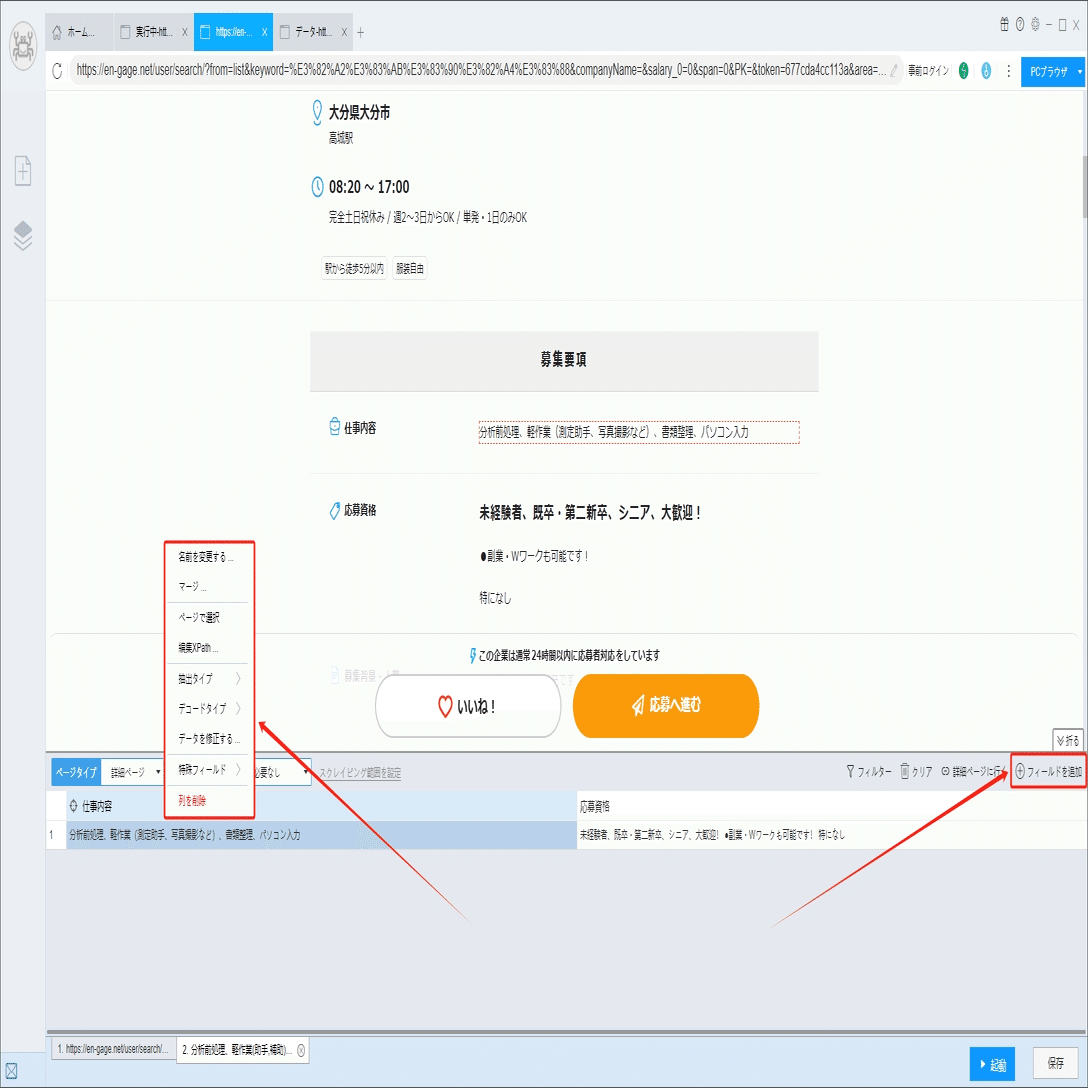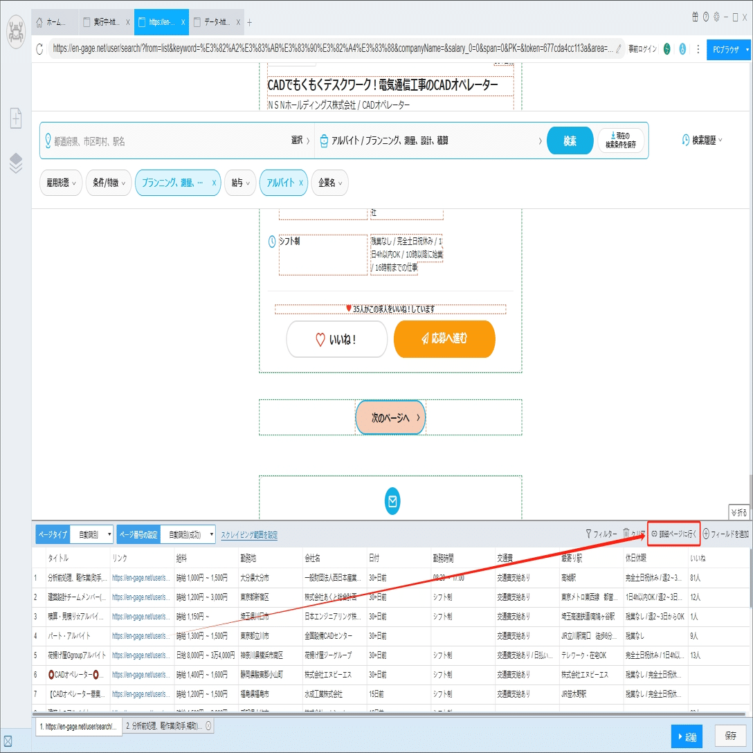ソフトウェアの「詳細ページに行く」機能を利用し、仕事内容、応募資格などの情報を抽出します。