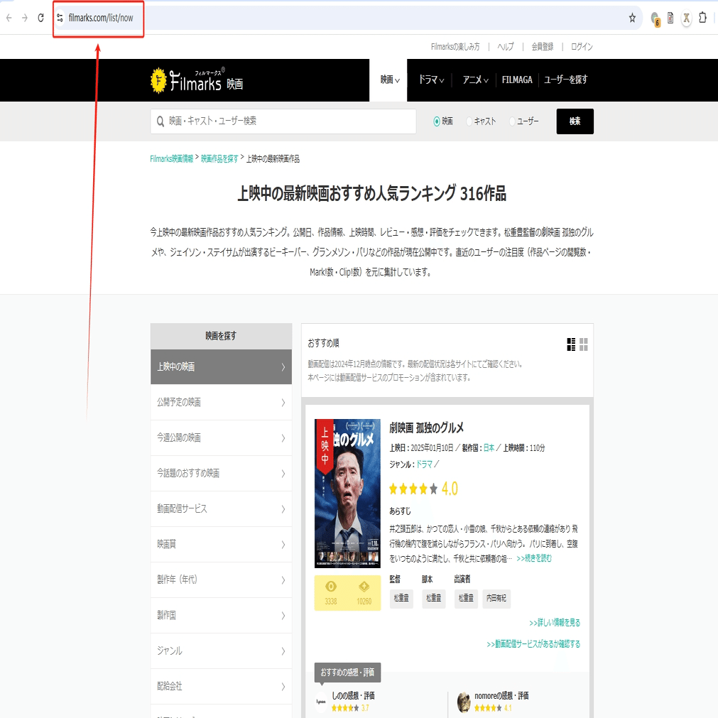 今回は上映中の最新映画おすすめ人気ランキングページを例として、スクレイピング方法を紹介します。まず、URLをコピーしてください。