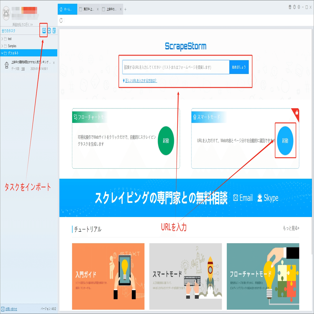 ScrapeStormのホームページ画面にスマートモードタスクを新規作成します。また、持っているタスクをインポートすることもできます。