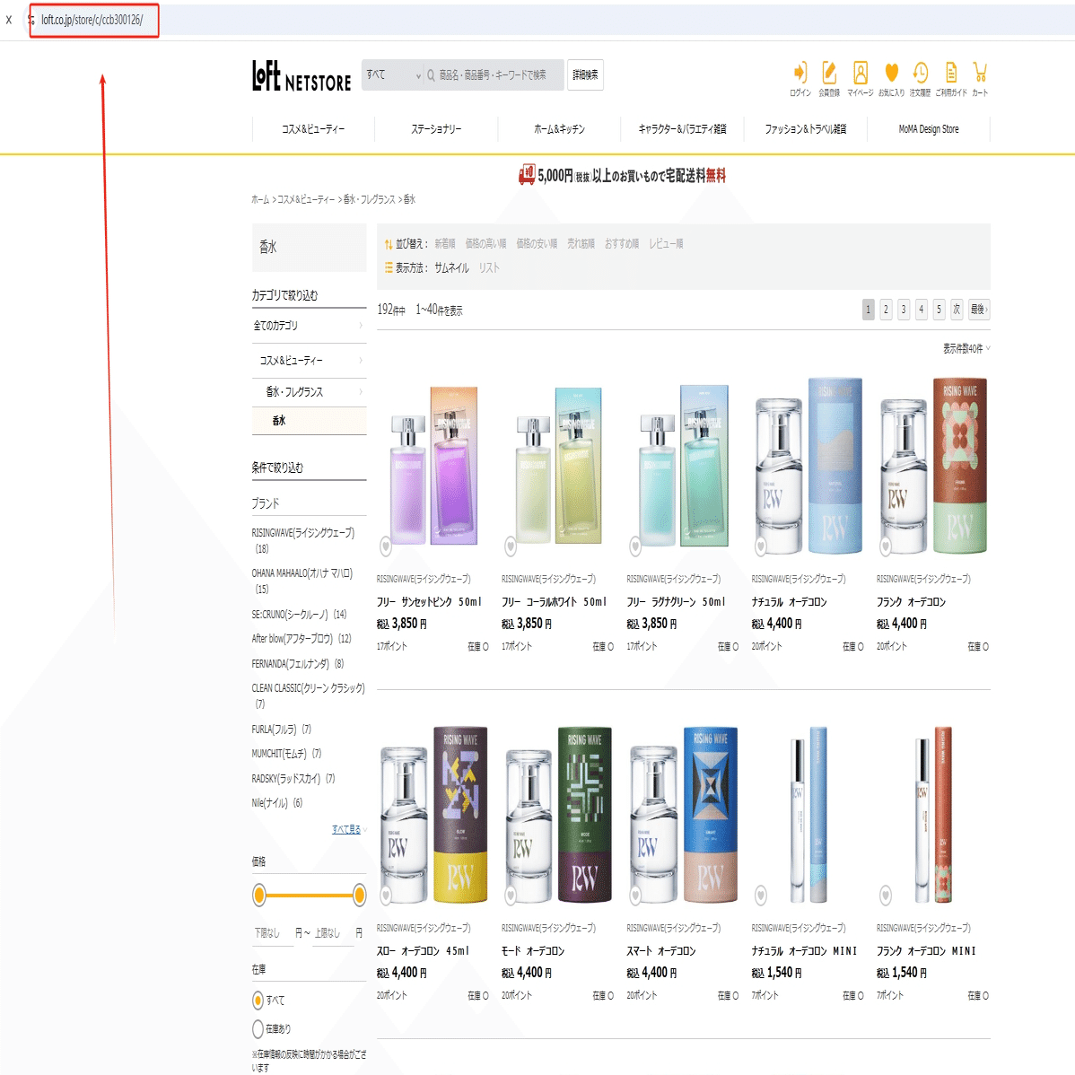 今回は香水・フレグランスの検索結果一覧ページから香水の情報を収得し、そのスクレイピング方法を紹介します。まず、URLをコピーしてください。