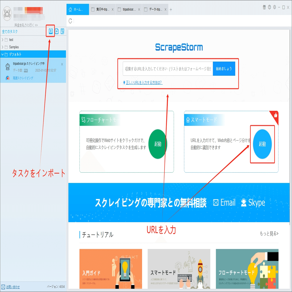 ScrapeStormのホームページ画面にスマートモードタスクを新規作成します。また、持っているタスクをインポートすることもできます。