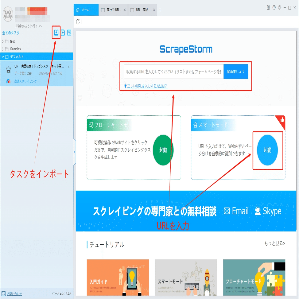 ScrapeStormのホームページ画面にスマートモードタスクを新規作成します。また、持っているタスクをインポートすることもできます。