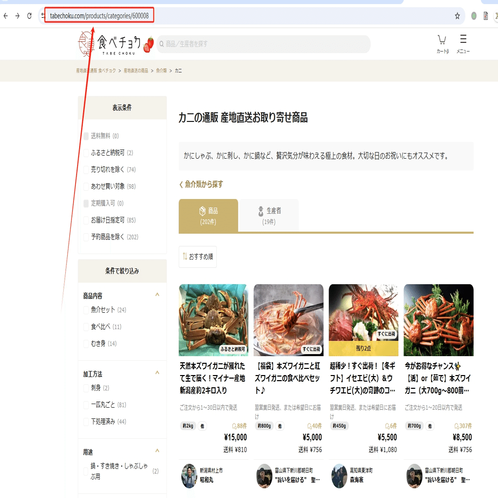 今回はカニの通販 産地直送お取り寄せ商品一覧ページを例として、スクレイピング方法を紹介します。まず、URLをコピーしてください。