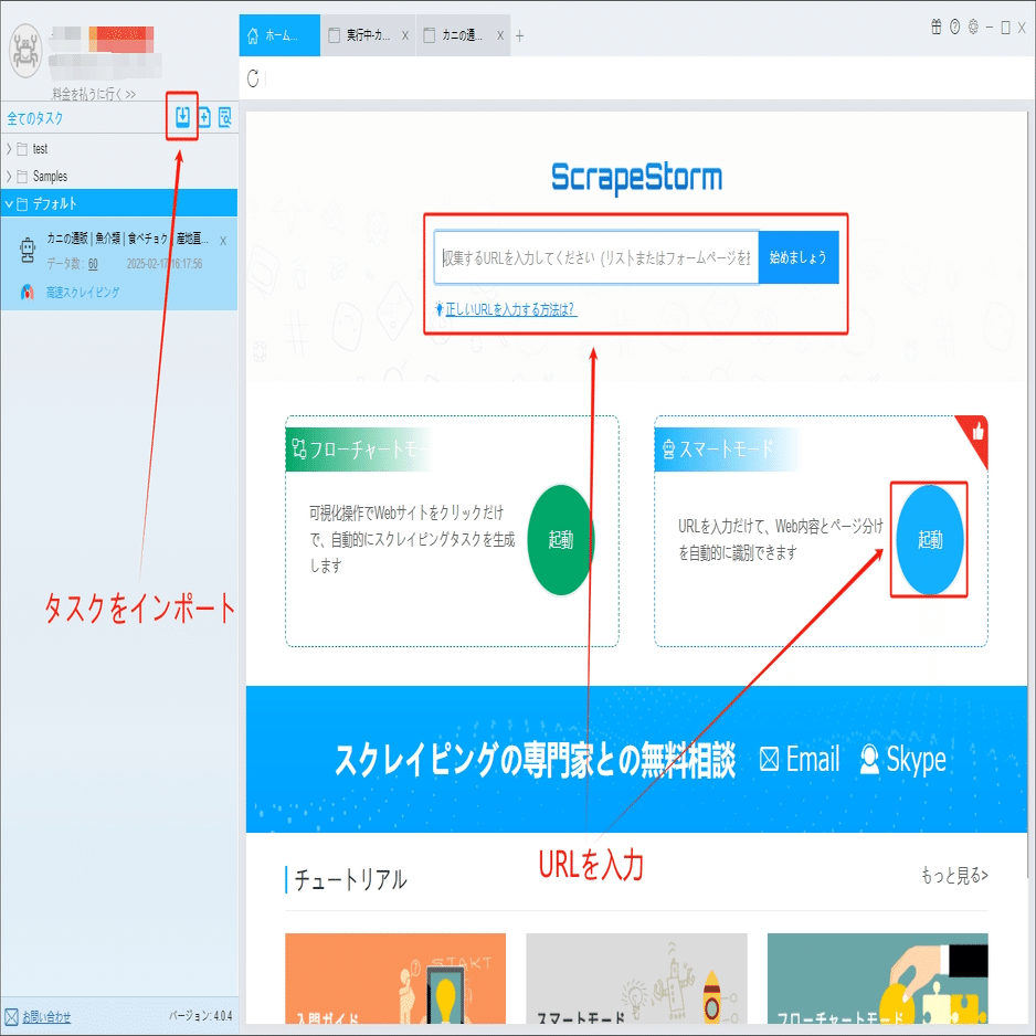 ScrapeStormのホームページ画面にスマートモードタスクを新規作成します。また、持っているタスクをインポートすることもできます。