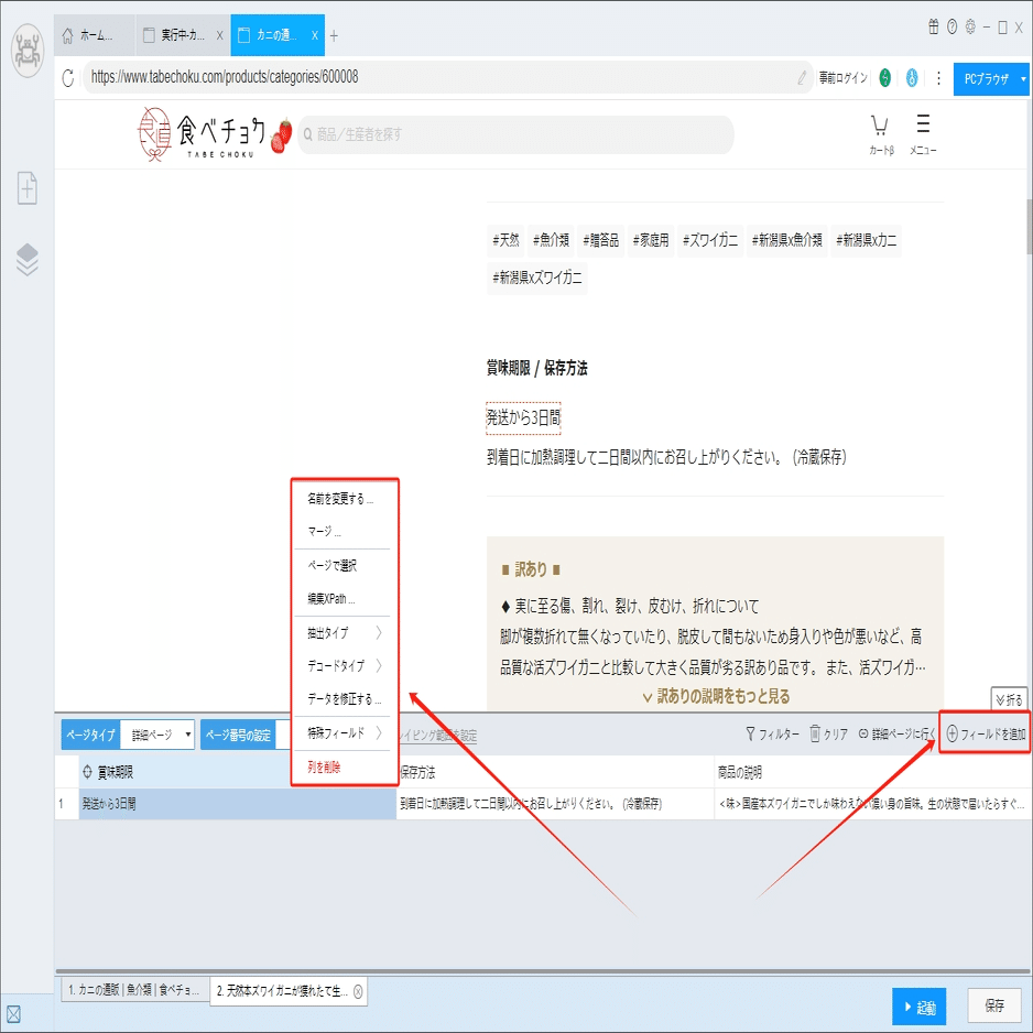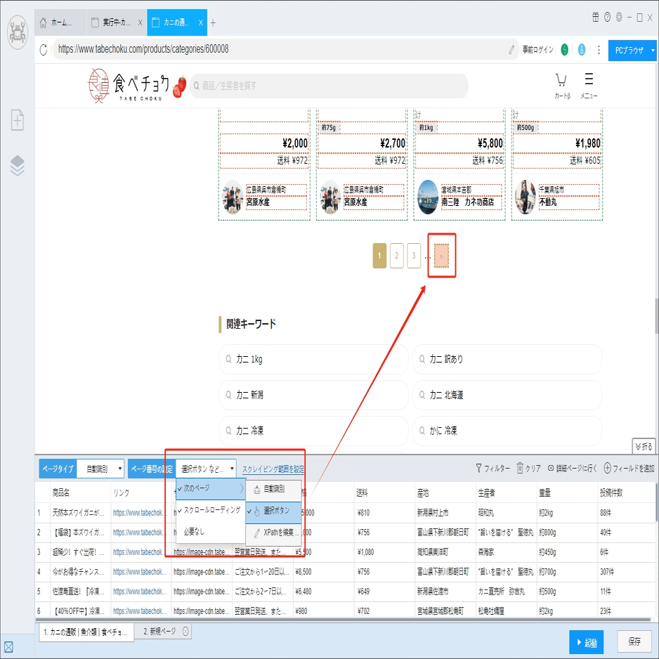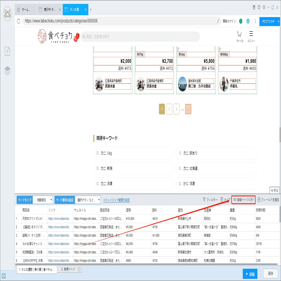 「詳細ページに行く」ボタンをクリックして、商品の詳細情報ページに移動して、生産者、産地、発送などの情報も抽出できます。