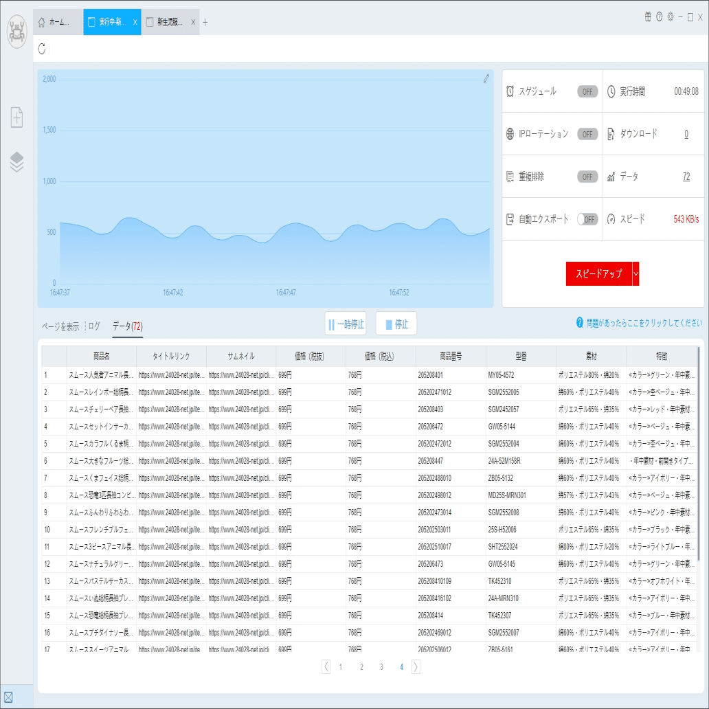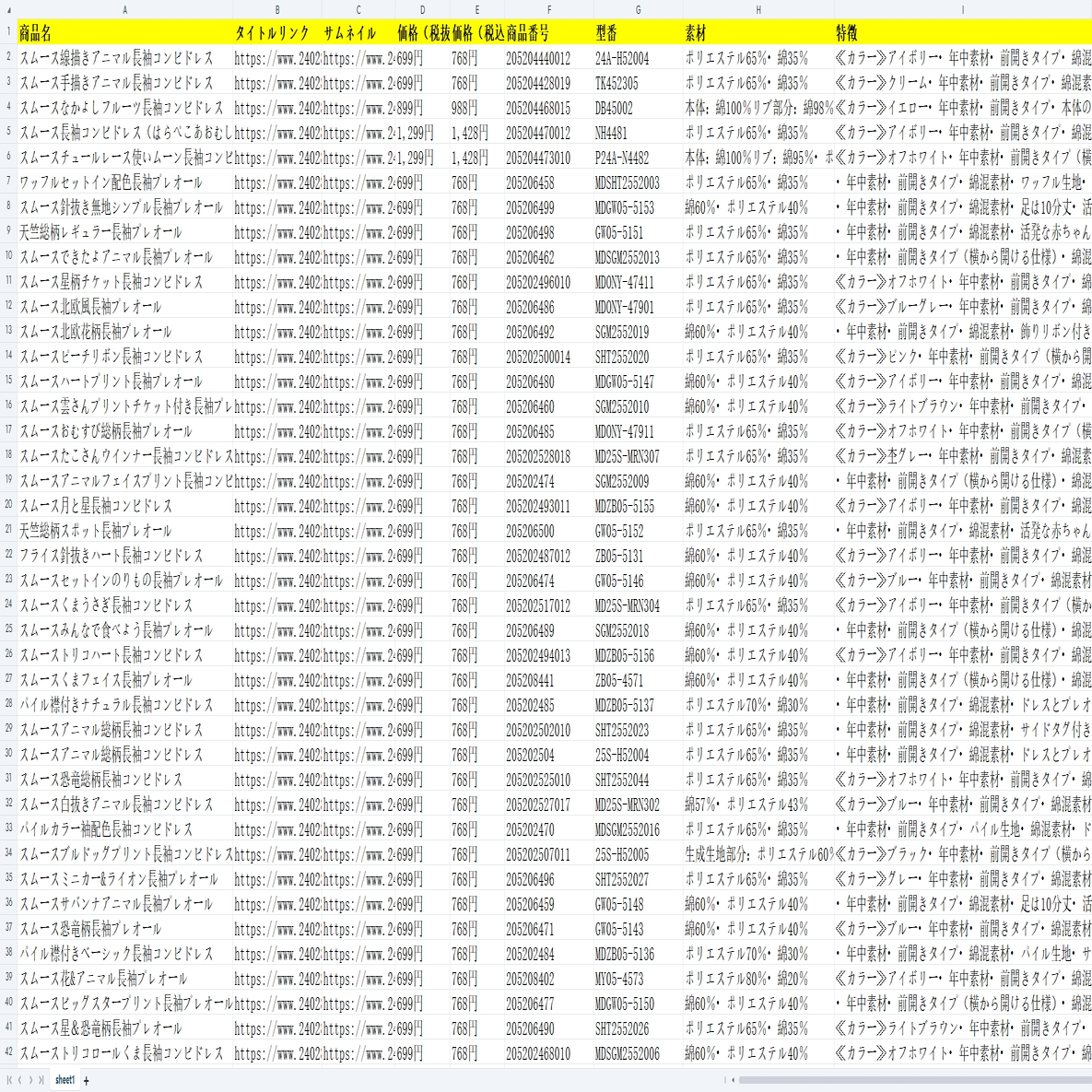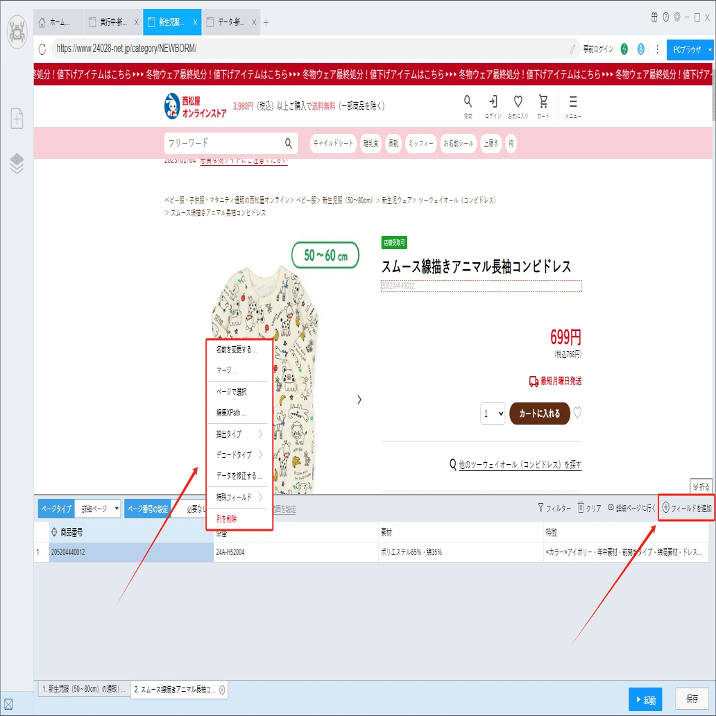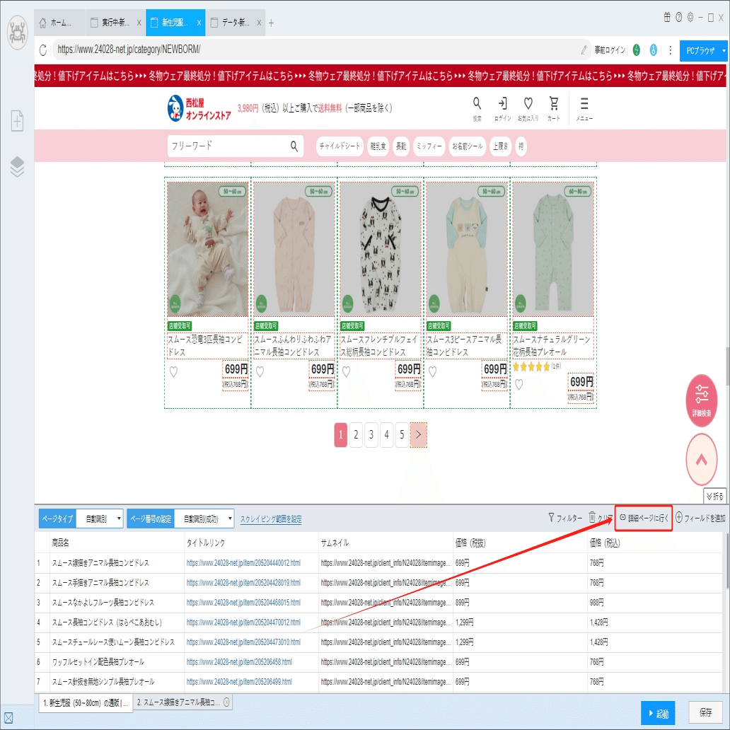 ソフトウェアの「詳細ページに行く」機能を利用し、型番、商品番号、特徴、素材などの情報を抽出します。