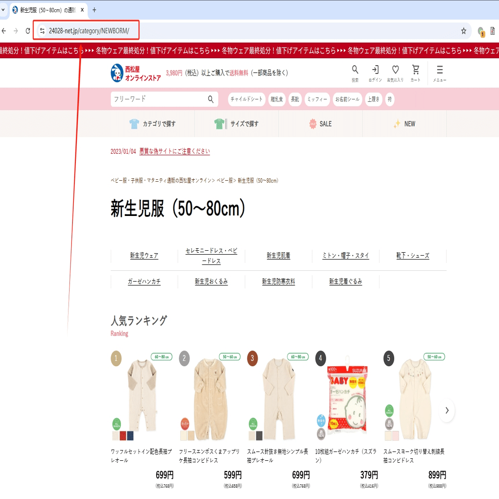 今回は新生児服(50~80cm)の検索結果ページからベビー服の情報を収得し、そのスクレイピング方法を紹介します。まず、URLをコピーしてください。