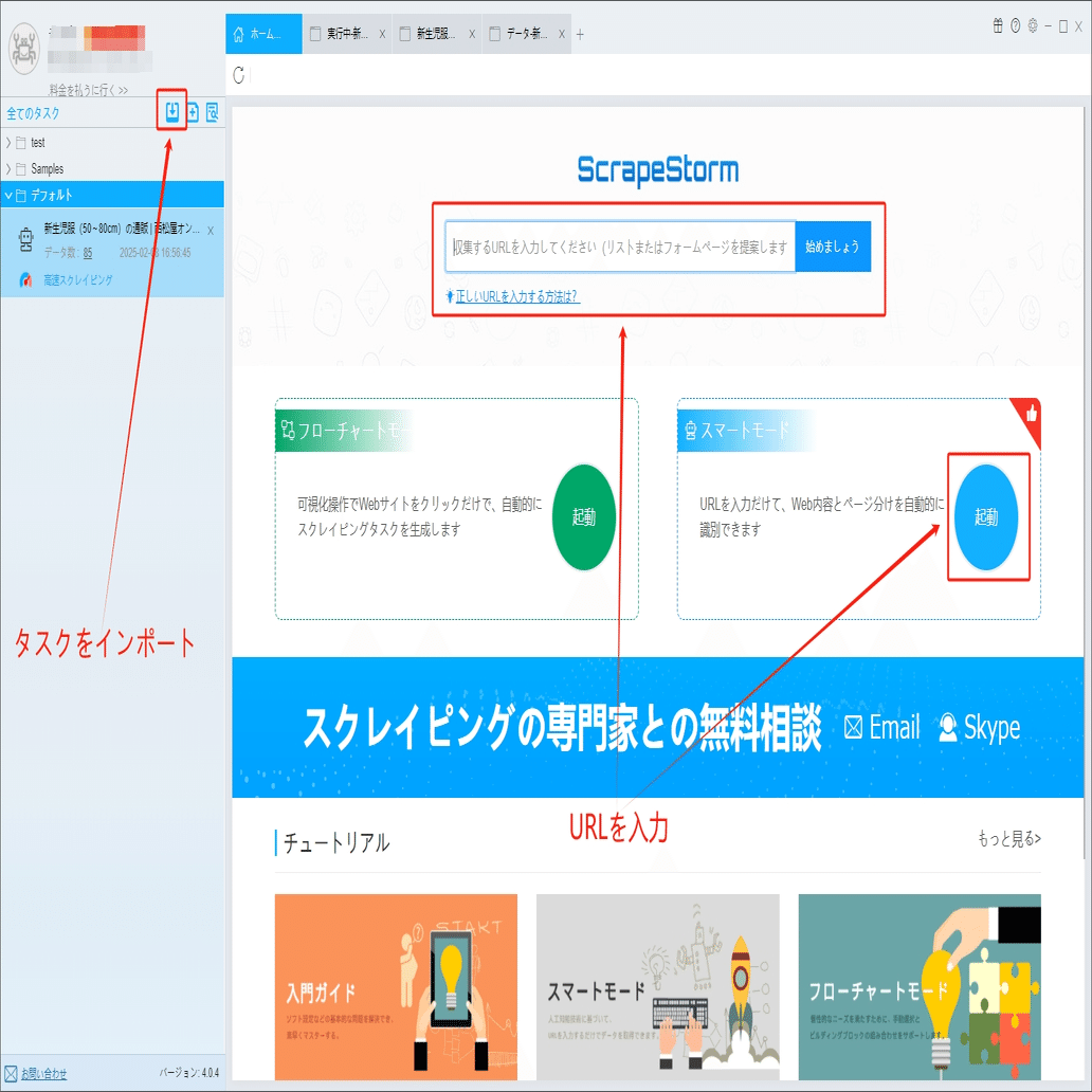 ScrapeStormのホームページ画面にスマートモードタスクを新規作成します。また、持っているタスクをインポートすることもできます。