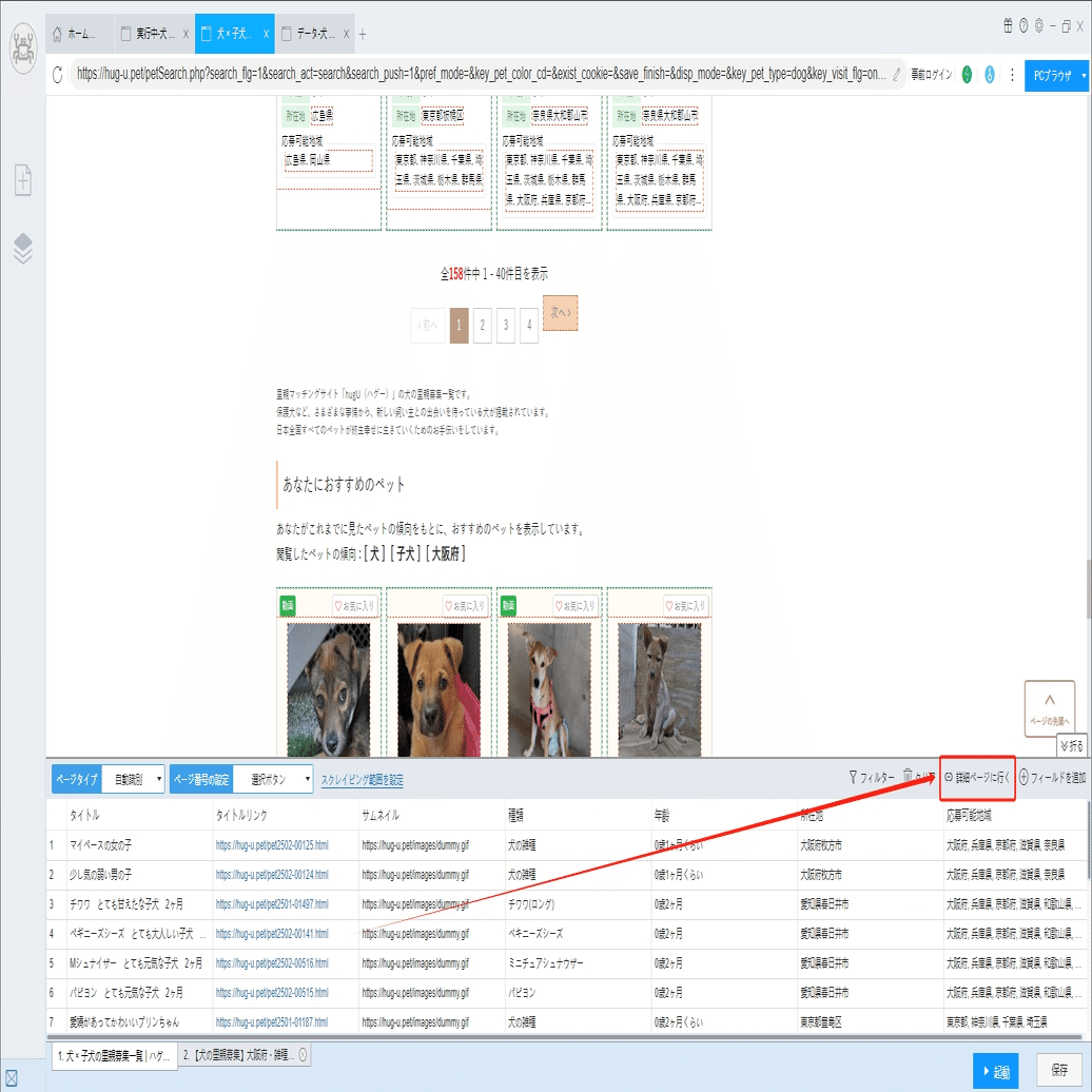 ソフトウェアの「詳細ページに行く」機能を利用し、ワクチン接種、単身者応募、高齢者応募などの情報を抽出します。