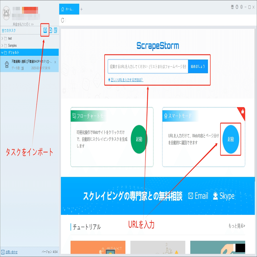 ScrapeStormのホームページ画面にスマートモードタスクを新規作成します。また、持っているタスクをインポートすることもできます。