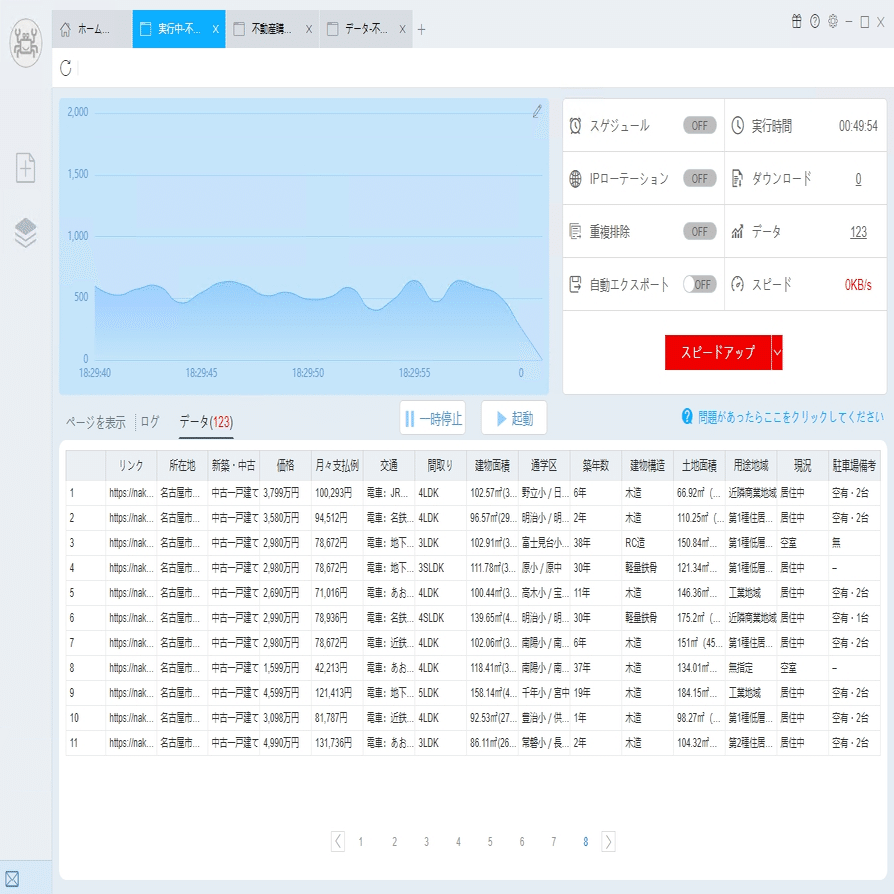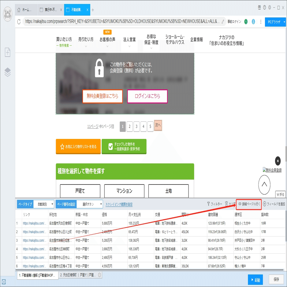 ソフトウェアの「詳細ページに行く」機能を利用し、土地面積、駐車場備考、現況などの情報を抽出します。