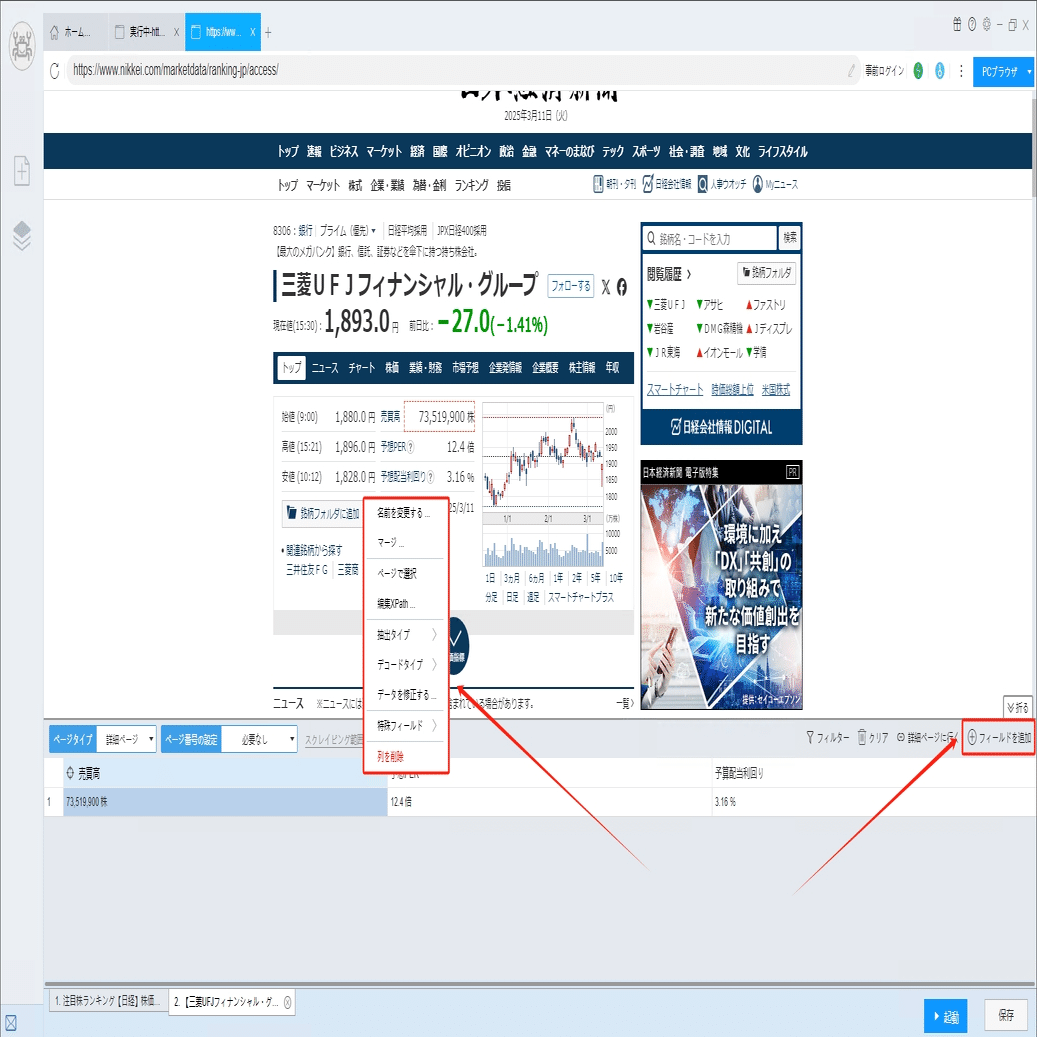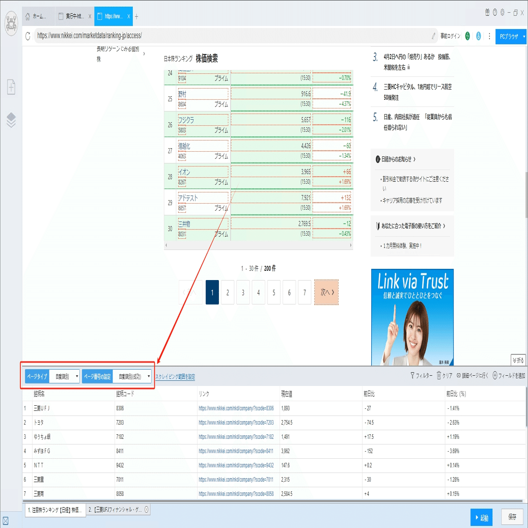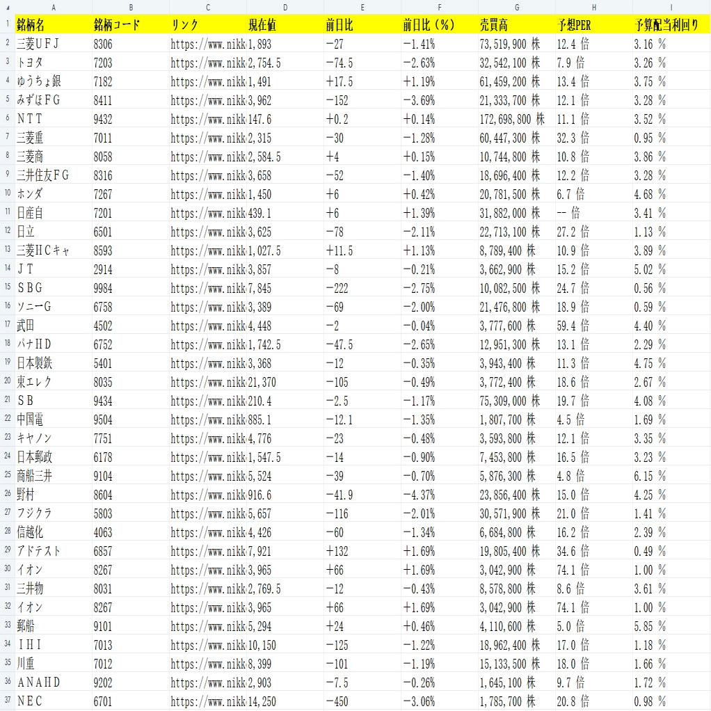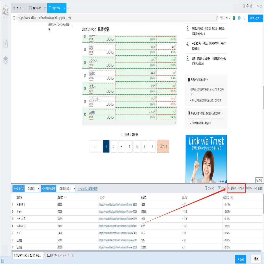 ソフトウェアの「詳細ページに行く」機能を利用し、売買高、予想PER、予想配当利回りなどの情報を抽出します。
