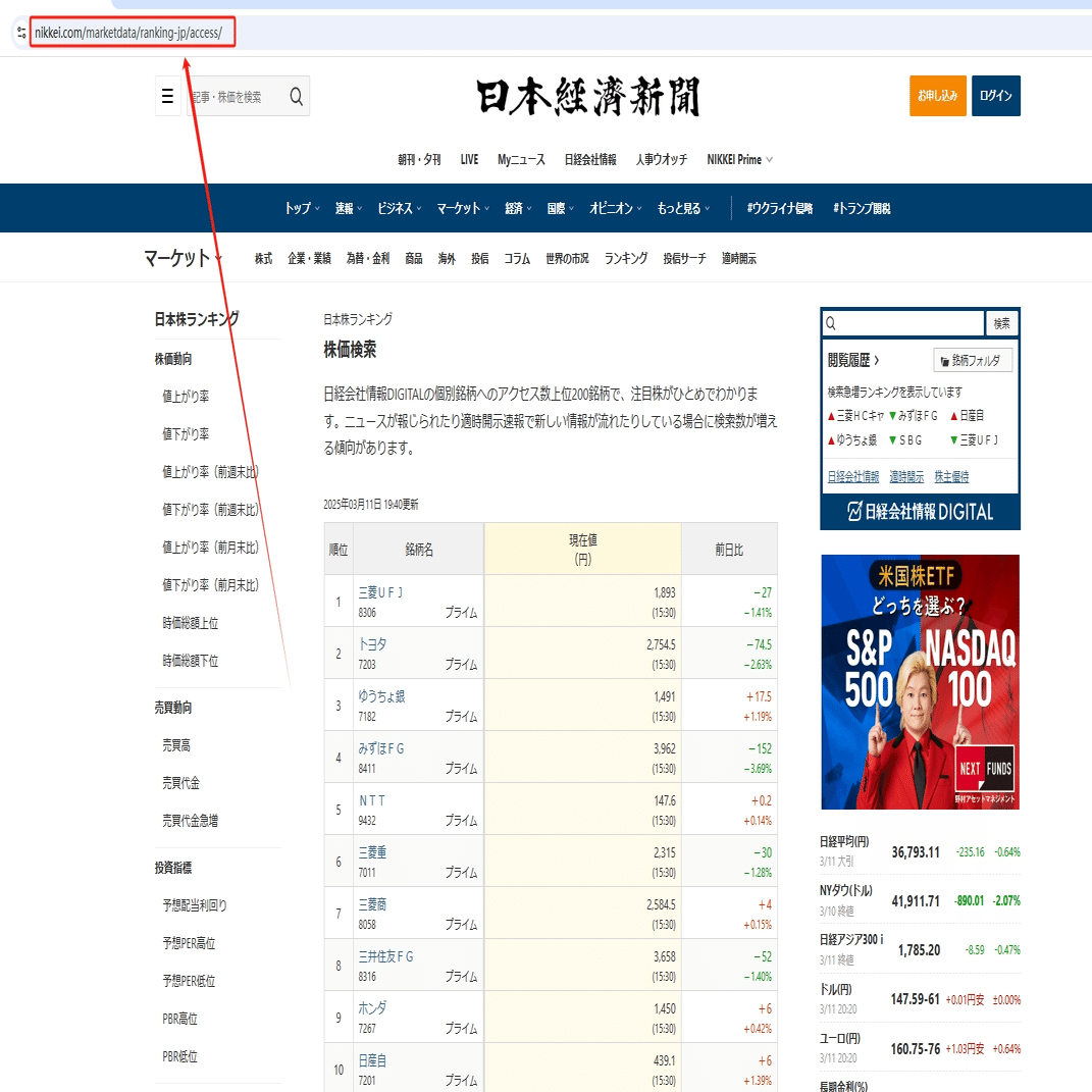 今回は株価検索ランキングページから注目株の株価指数を収得し、そのスクレイピング方法を紹介します。まず、URLをコピーしてください。