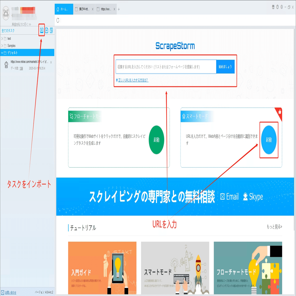 ScrapeStormのホームページ画面にスマートモードタスクを新規作成します。また、持っているタスクをインポートすることもできます。