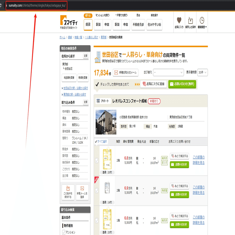 今回は世田谷区で一人暮らし・単身向けの賃貸物件一覧ページを例として、そのスクレイピング方法を紹介します。まず、URLをコピーしてください。