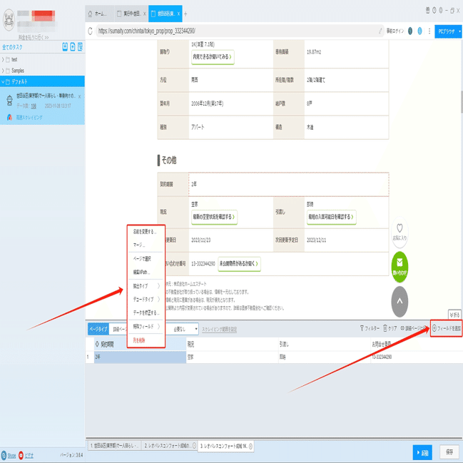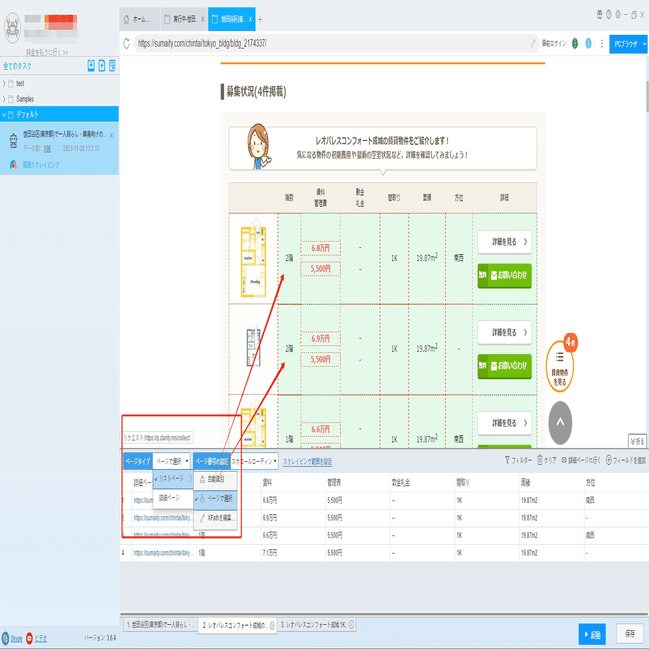 詳細ページを開くと、ソフトウェアはデフォルト「詳細ページモード」になり、手動でリスト要素を選択し、掲載している物件リストを識別できます。