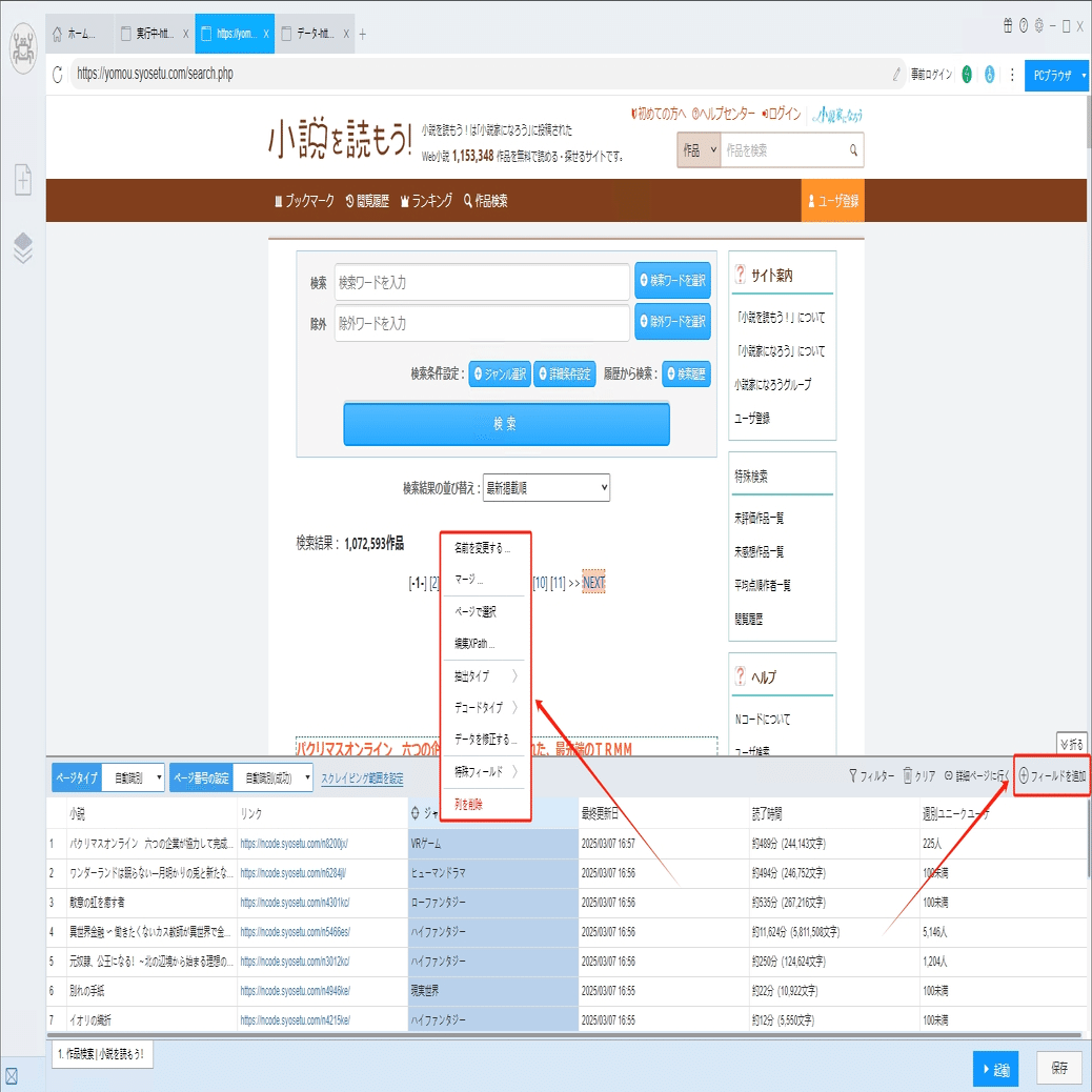 「フィールドを追加」ボタンをクリックして、画面に必要な要素を選択、データが自動的に抽出されます。また、必要に応じてフィールドの名前の変更または削除、結合できます。