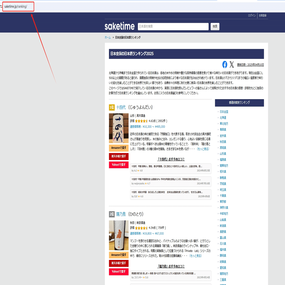 今回は日本全国の日本酒ランキング2025ページからお酒の情報を収得し、そのスクレイピング方法を紹介します。まず、URLをコピーしてください。
