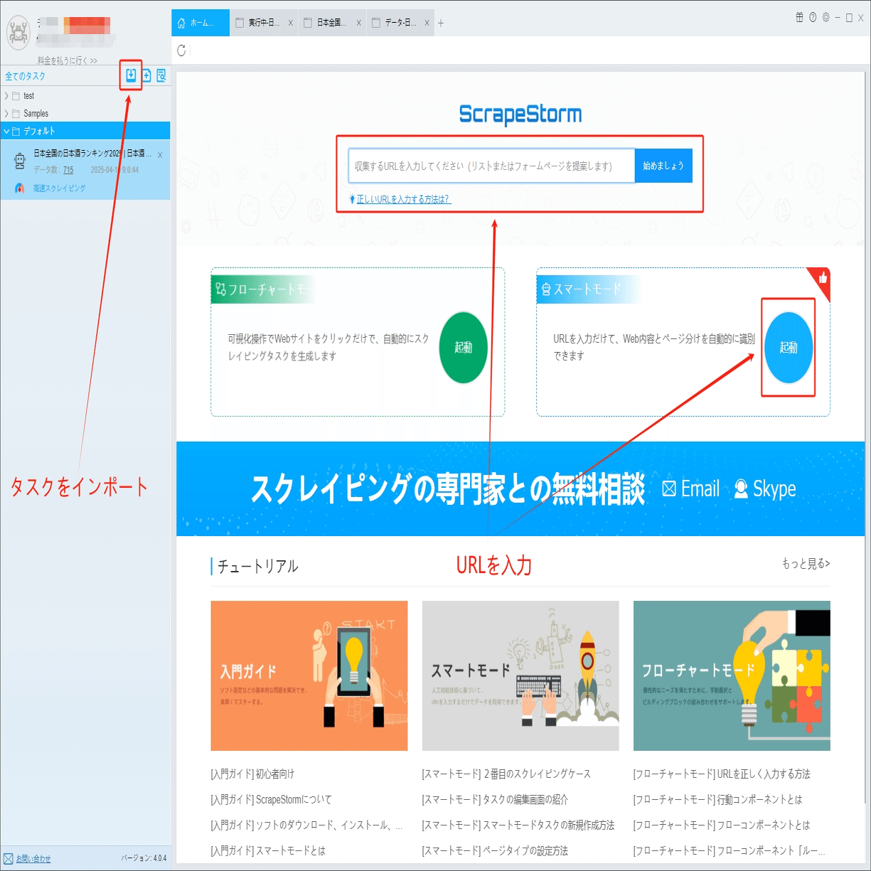 ScrapeStormのホームページ画面にスマートモードタスクを新規作成します。また、持っているタスクをインポートすることもできます。
