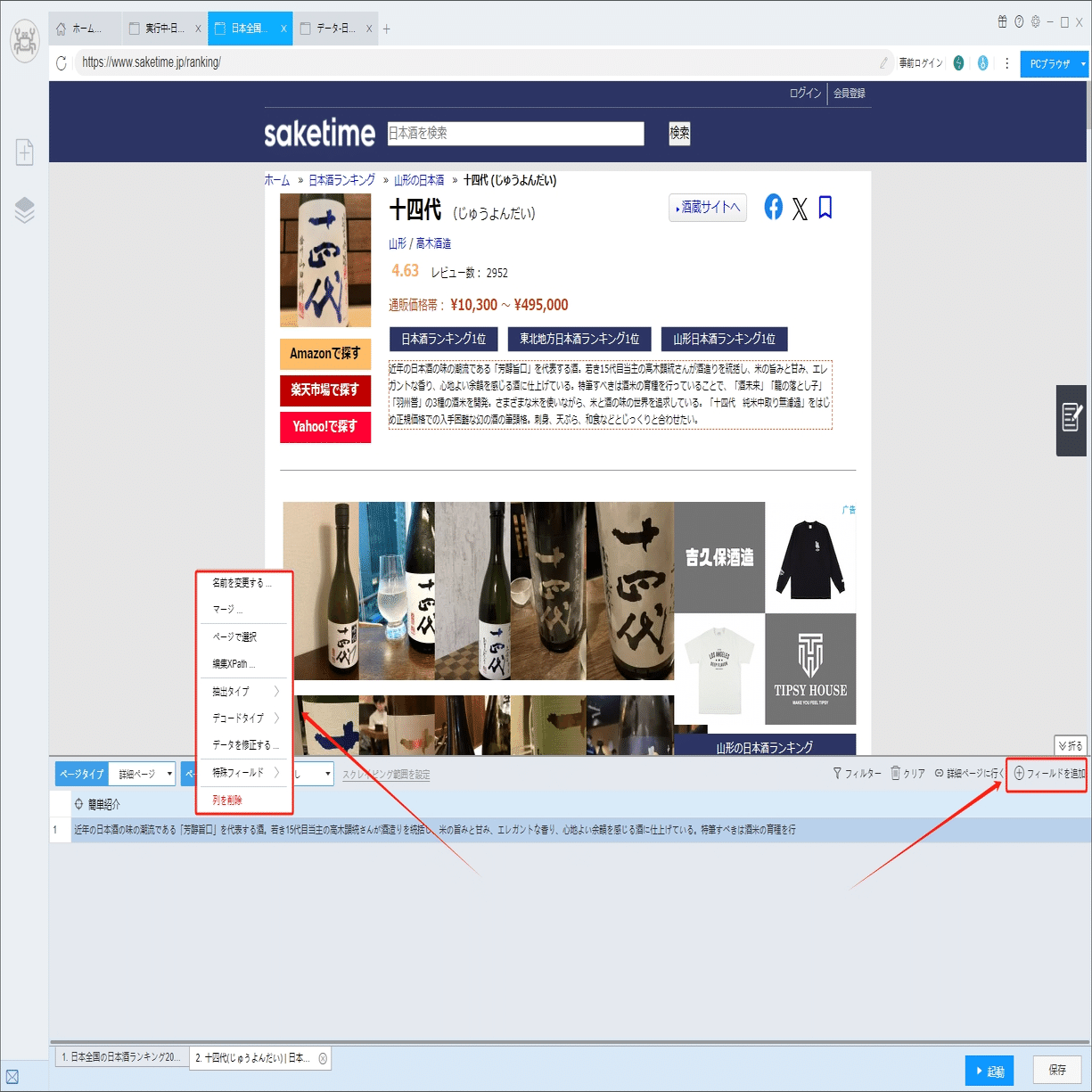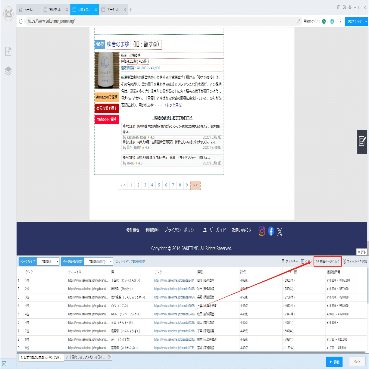 ソフトウェアの「詳細ページに行く」機能を利用し、お酒の簡単紹介を抽出します。