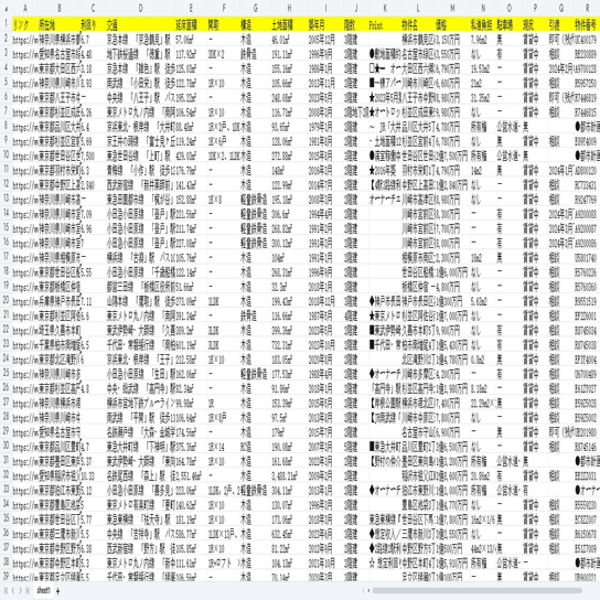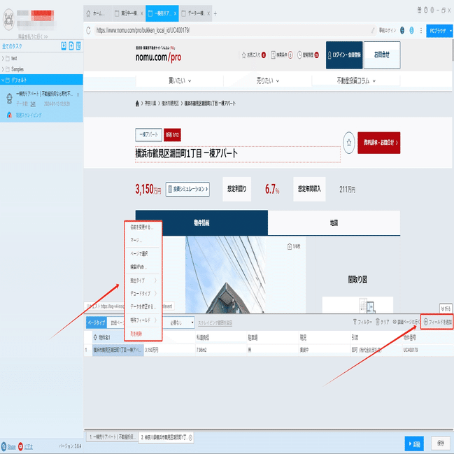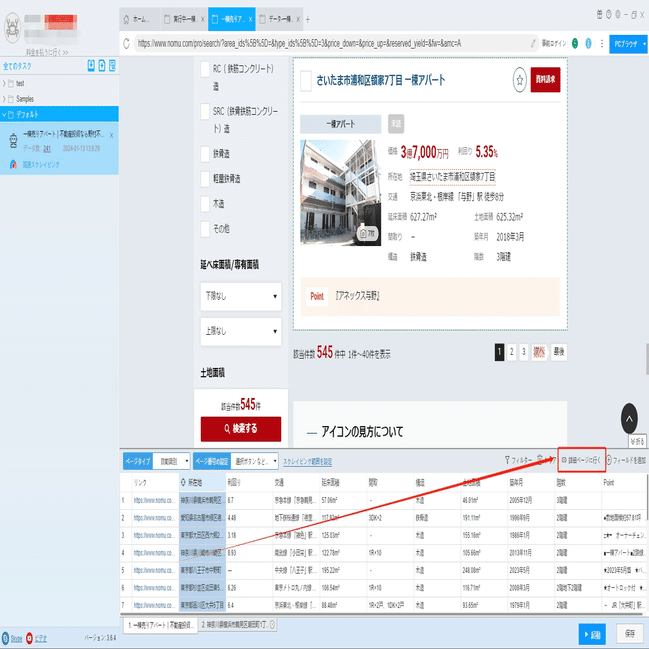 ソフトウェアの「詳細ページに行く」機能を利用し、価格、駐車場、私道負担、物件番号などの情報を抽出します。