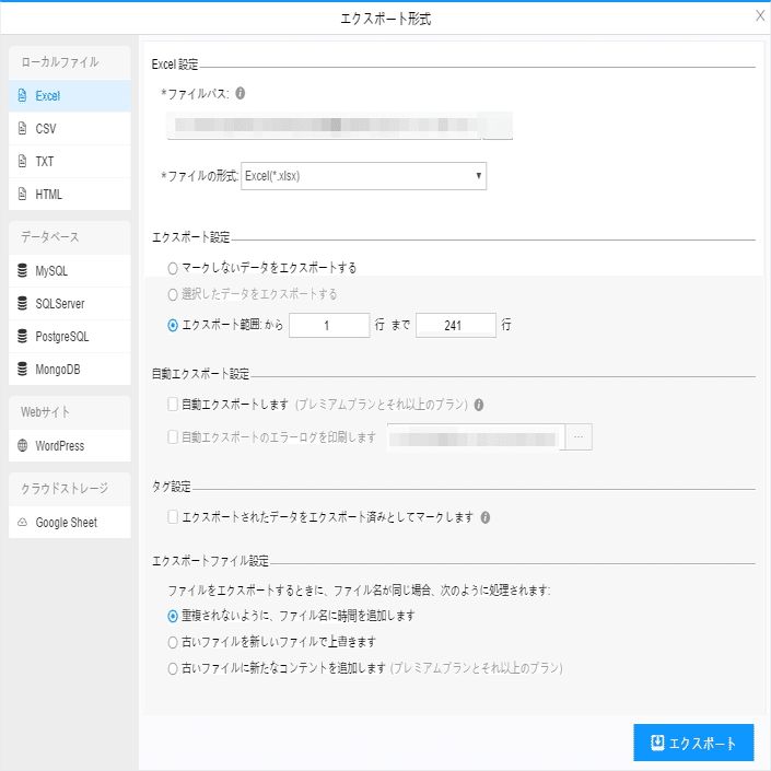 ScrapeStormは、Excel、csv、html、txt、データベース、ローカルなどさまざまなエクスポート方法を提供します。抽出結果のエクスポート方法の詳細には下記のチュートリアルをご参照ください。