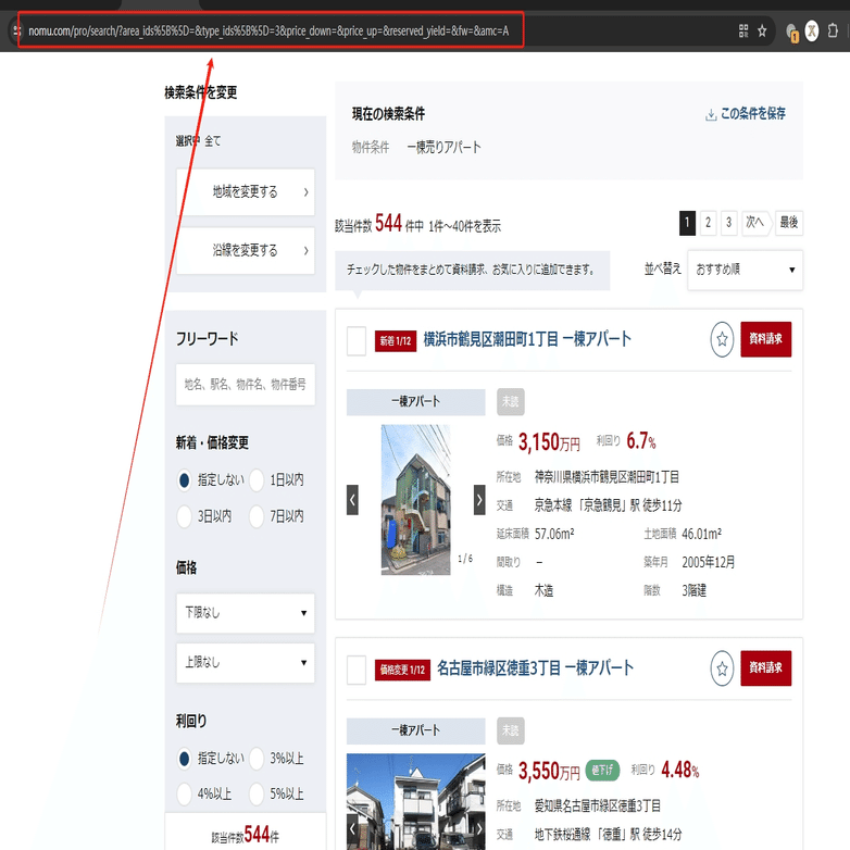 今回は一棟売りアパート物件一覧ページを例として、そのスクレイピング方法を紹介します。まず、URLをコピーしてください。