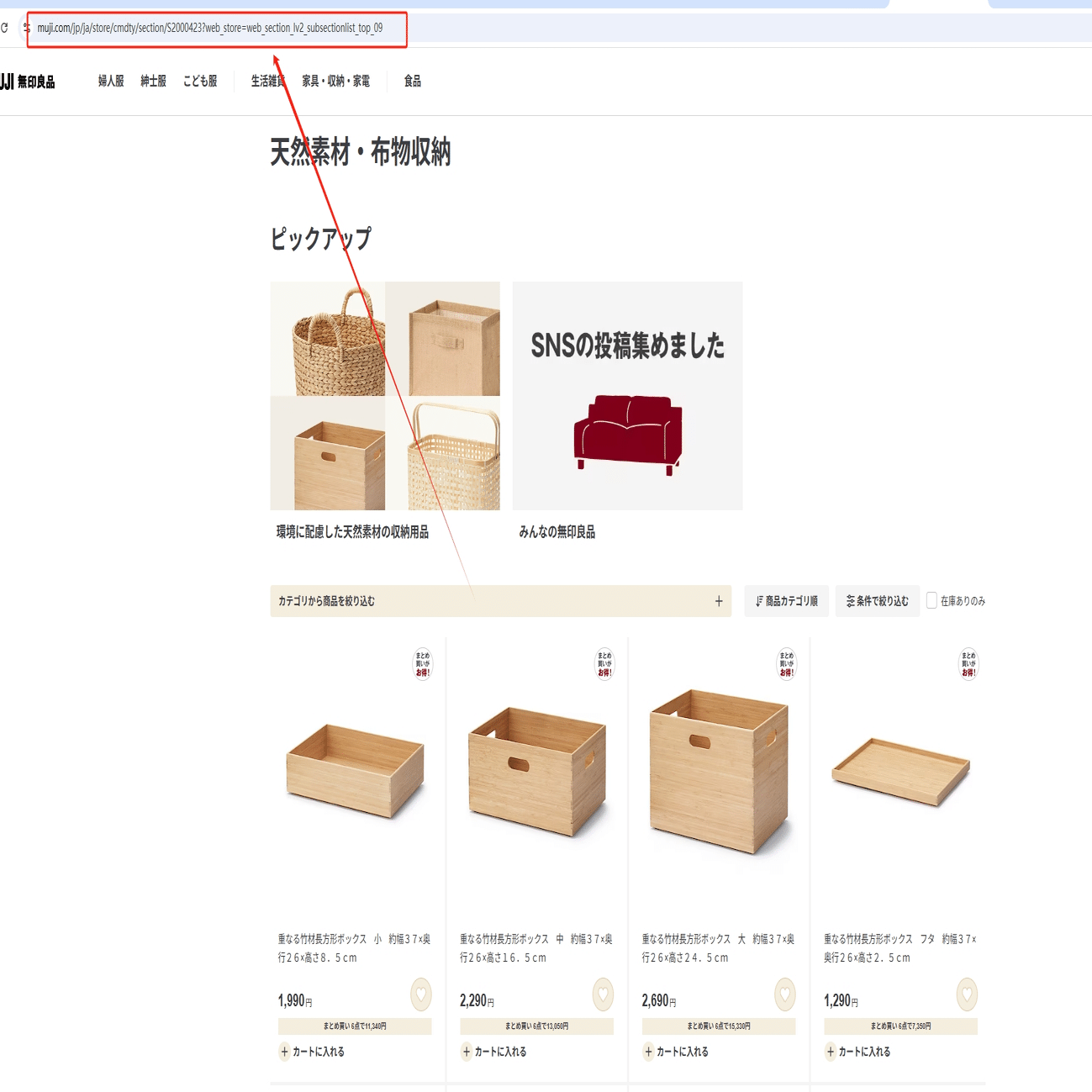 今回は天然素材・布物収納の商品一覧ページから商品の情報を収得し、そのスクレイピング方法を紹介します。まず、URLをコピーしてください。