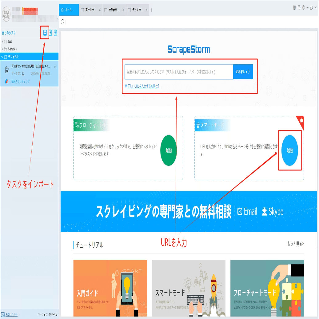 ScrapeStormのホームページ画面にスマートモードタスクを新規作成します。また、持っているタスクをインポートすることもできます。