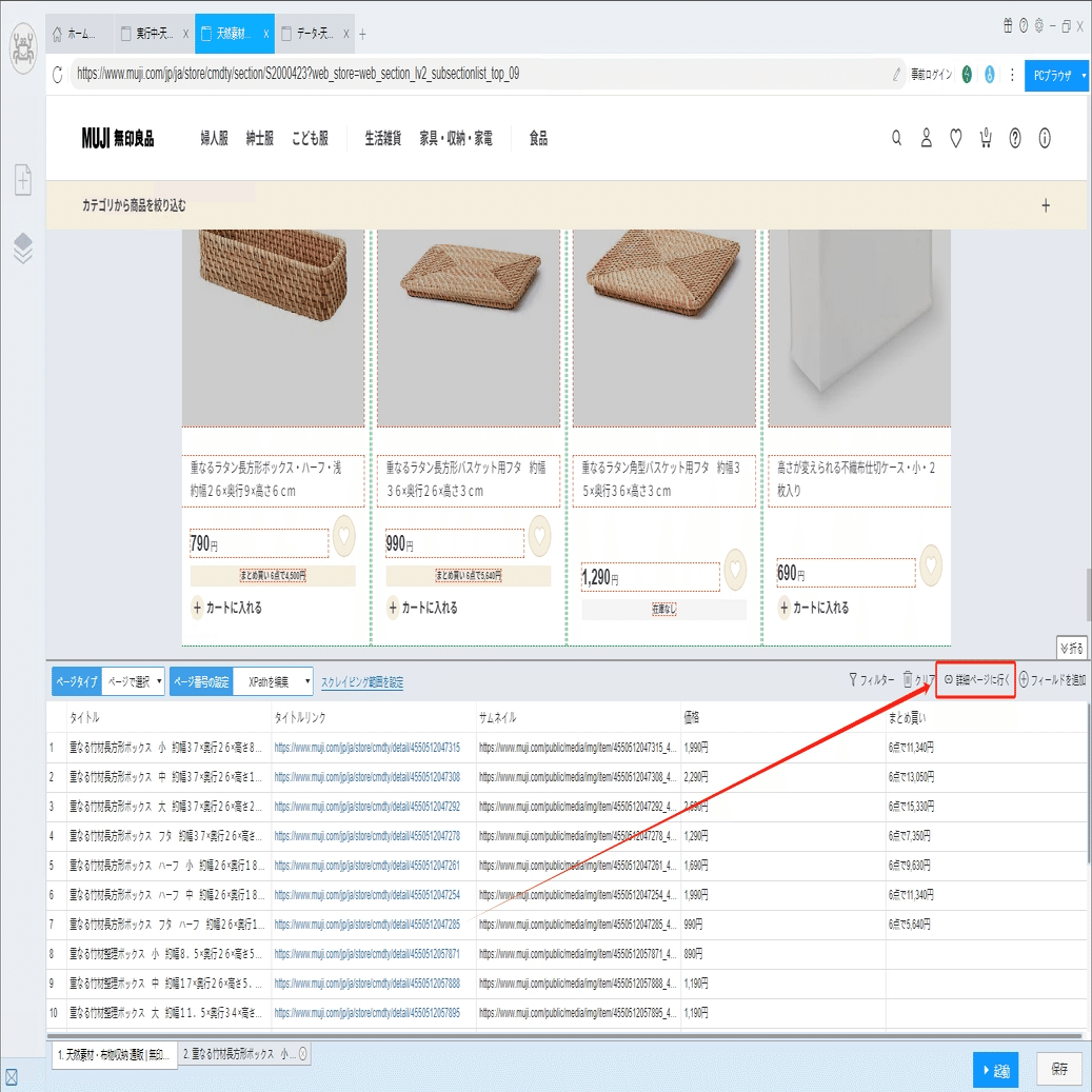 ソフトウェアの「詳細ページに行く」機能を利用し、価格、ブランド、商品説明などの情報を抽出します。