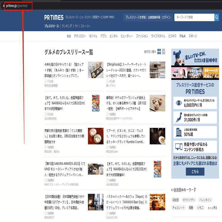 今回はグルメのプレスリリース一覧ページを例として、スクレイピング方法を紹介します。まず、URLをコピーしてください。