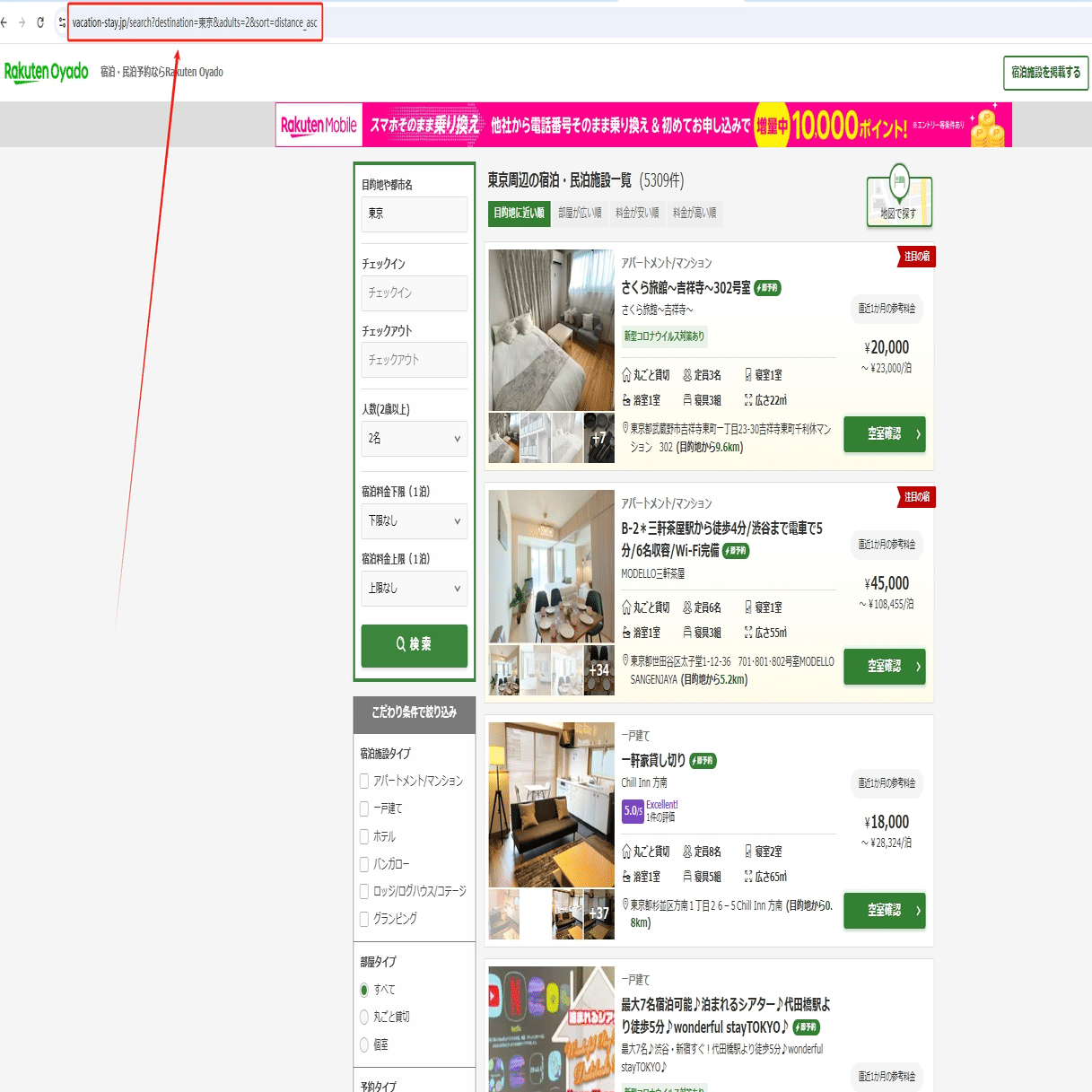 今回は東京周辺の宿泊・民泊施設一覧ページから民泊施設の情報を収得し、そのスクレイピング方法を紹介します。まず、URLをコピーしてください。
