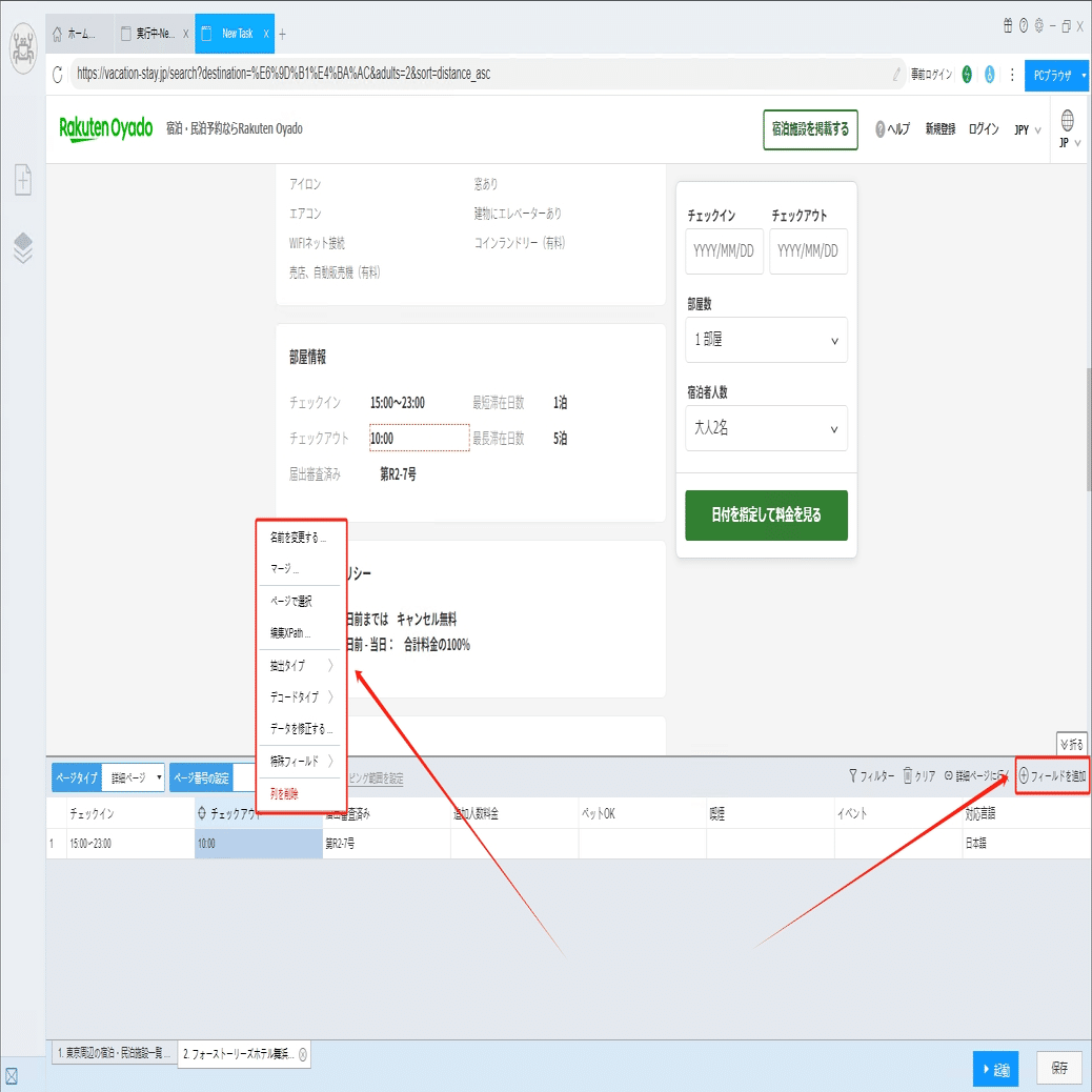 ソフトウェアの「詳細ページに行く」機能を利用し、チェックイン/チェックアウト時間、追加人数料金、喫煙などの情報を抽出します。