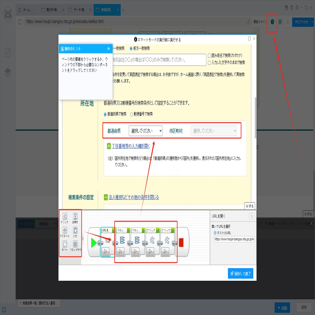 事前操作画面で、「ドロップダウン」、「クリック」などのコンポーネントを組み合わせて、検索条件を入力します。