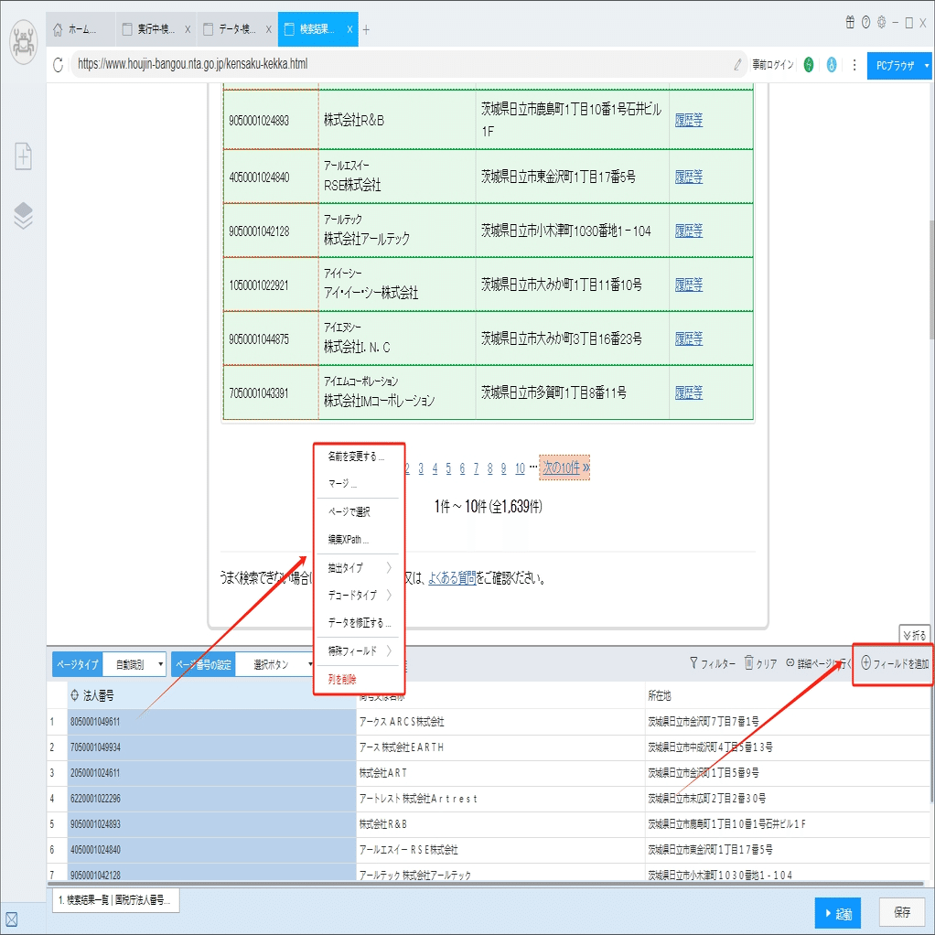 「フィールドを追加」ボタンをクリックして、画面に必要な要素を選択、データが自動的に抽出されます。また、必要に応じてフィールドの名前の変更または削除、結合できます。