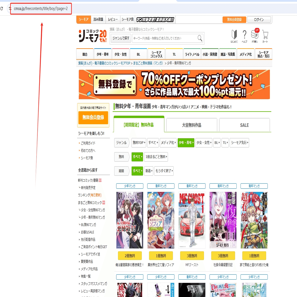 今回は少年・青年の一覧ページから書籍の情報を収得し、そのスクレイピング方法を紹介します。まず、第二ページのリンクをコピーしてください。